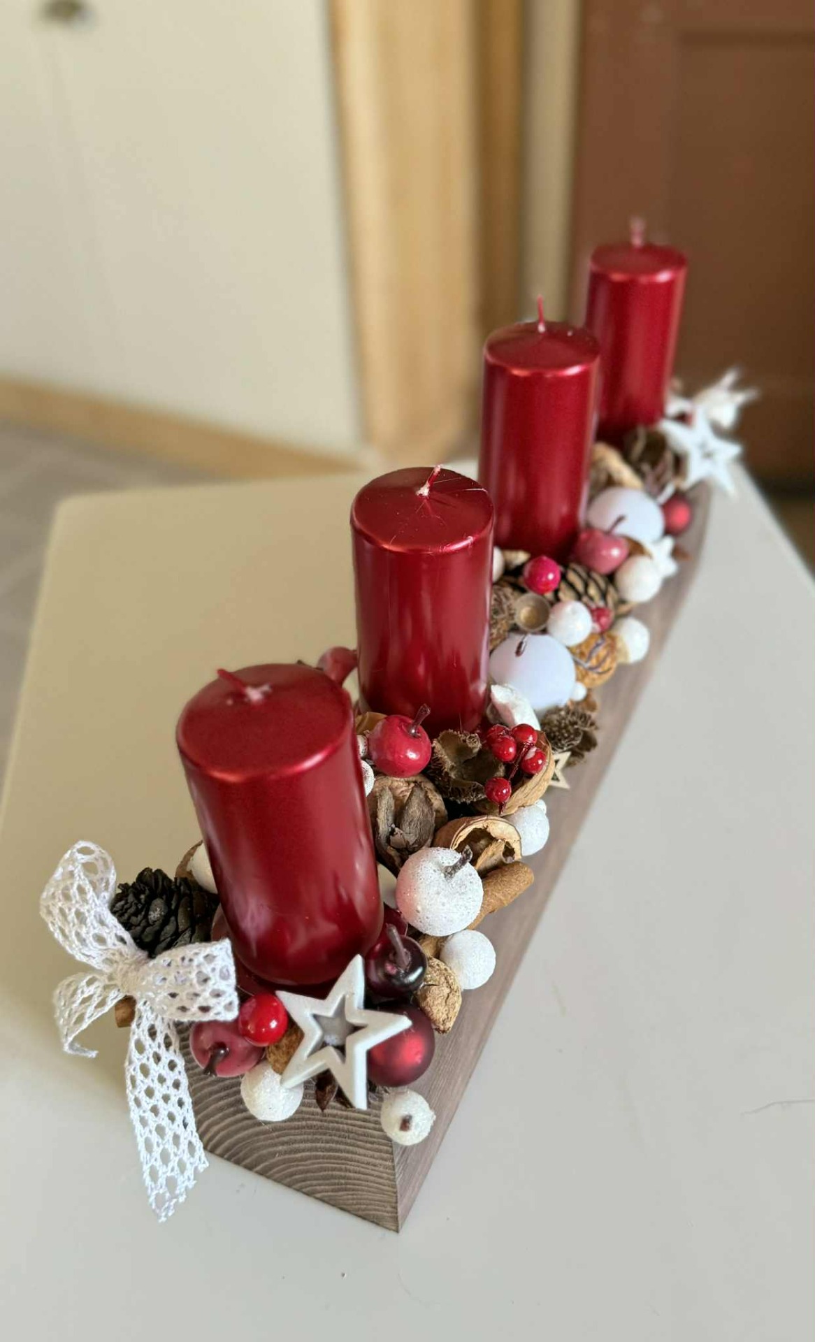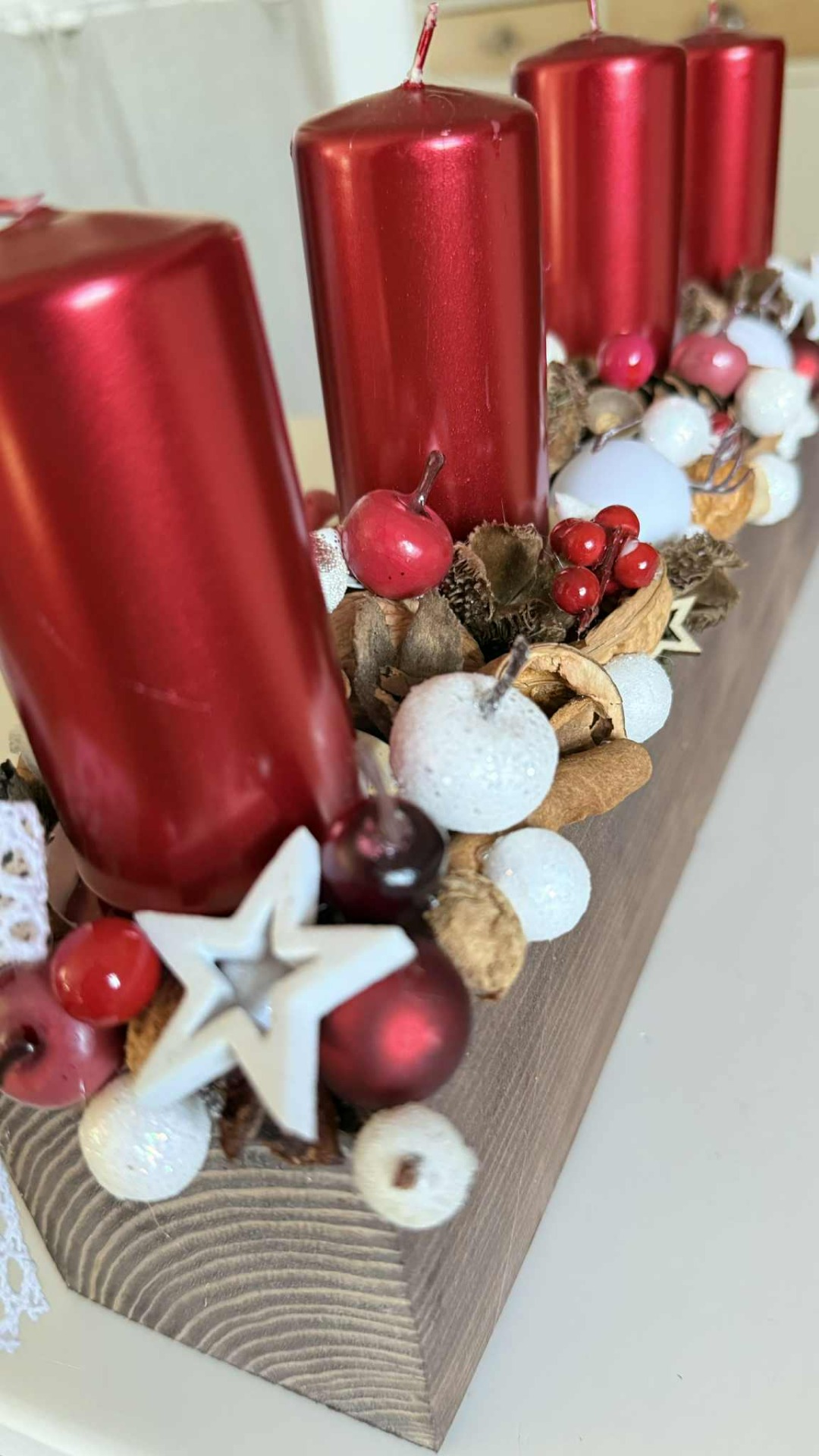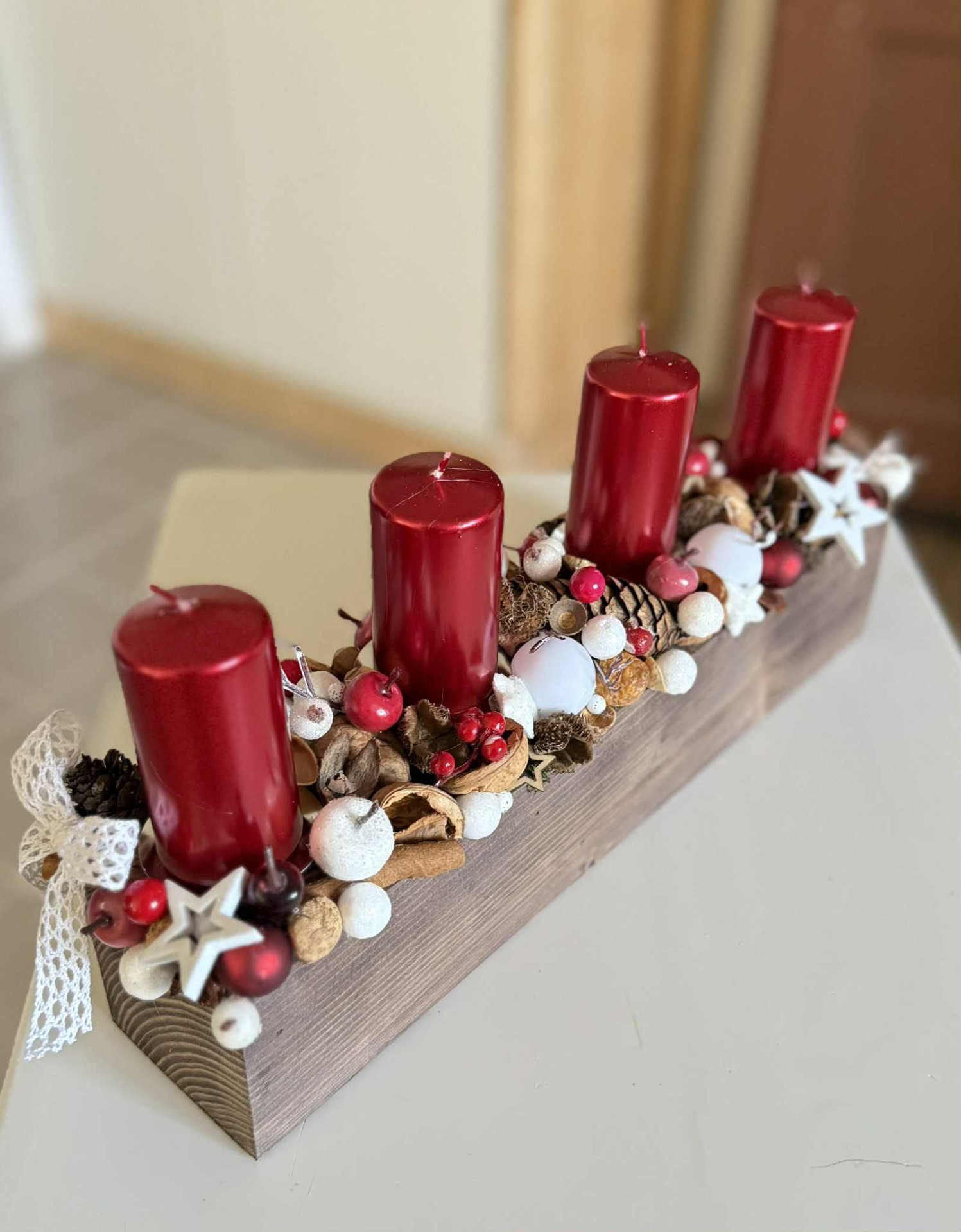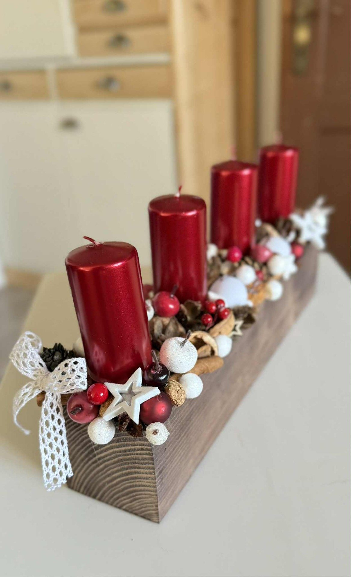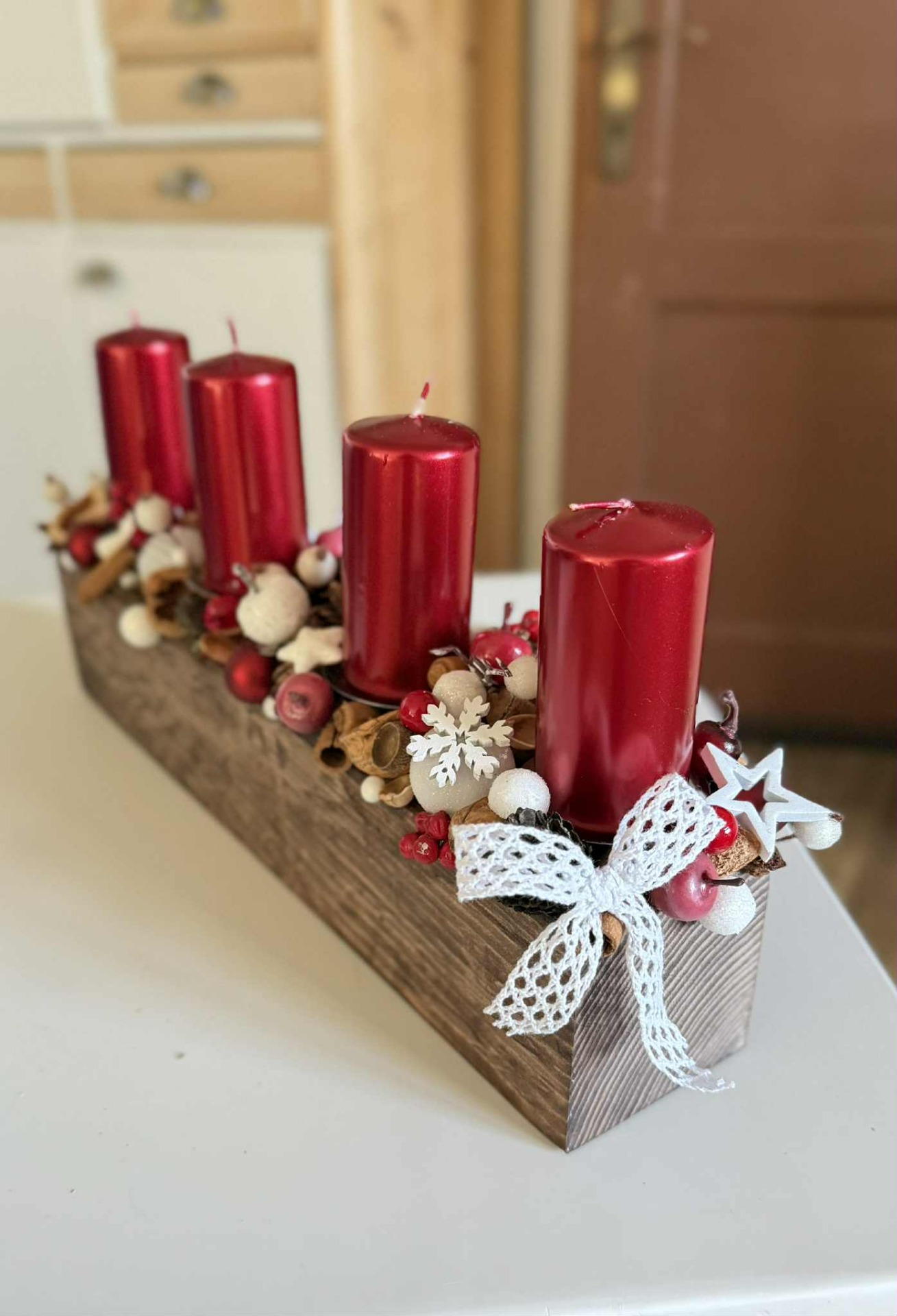 Adventní svícen v bílo-červených barvách, Zdoben je především přírodními dekoracemi a doladěn vánočními přízdobami.