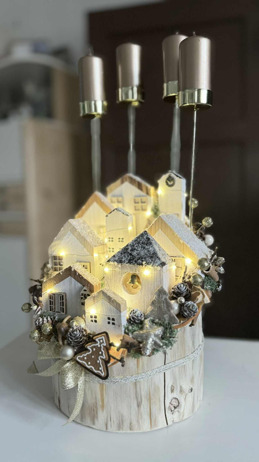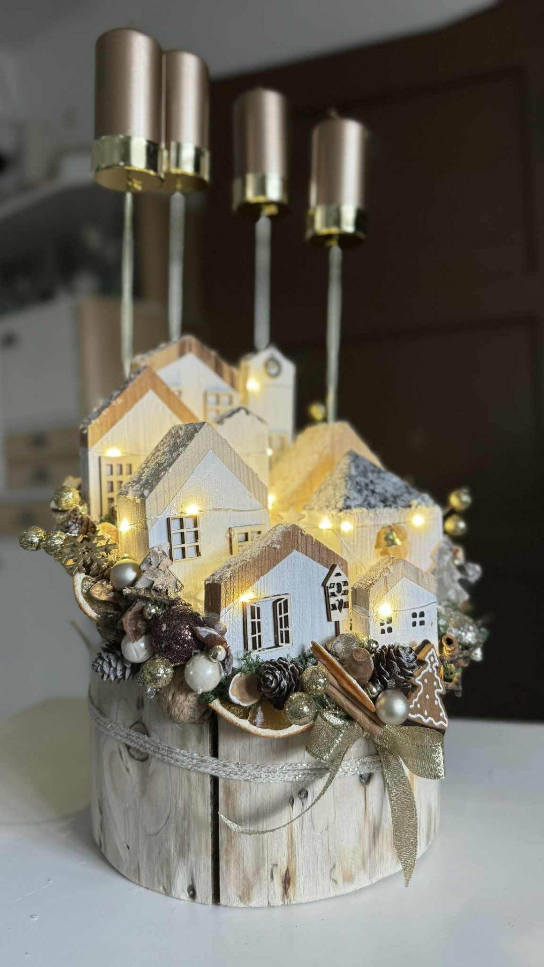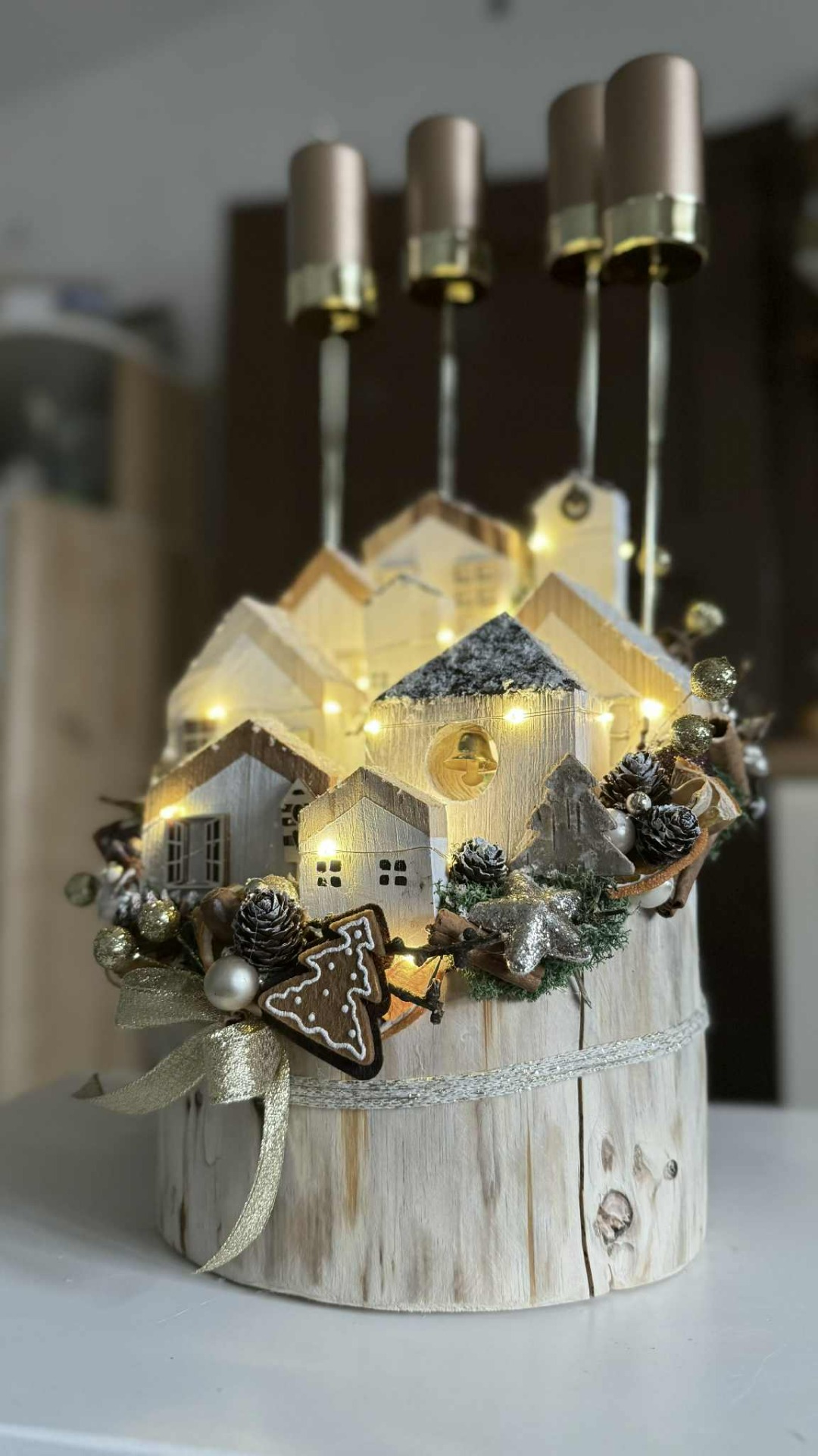 Vánoční svícen má výšku 45cm a šířka cca 25cm. Na vysokém, vyběleném špalku je usazeno 9 domečků se zvoničkou, které jsou doplněny vánočními přízdobami v hnědé a zlaté barvě, přírodními dekoracemi a světýlky. Dominantou jsou svíčky v hnědo-zlaté barvě, usazené do vysokých zlatých držáků.