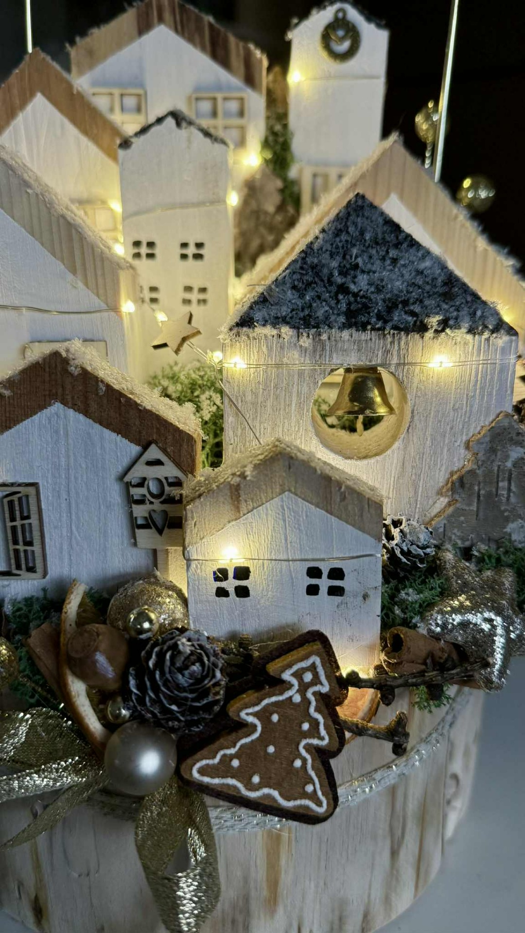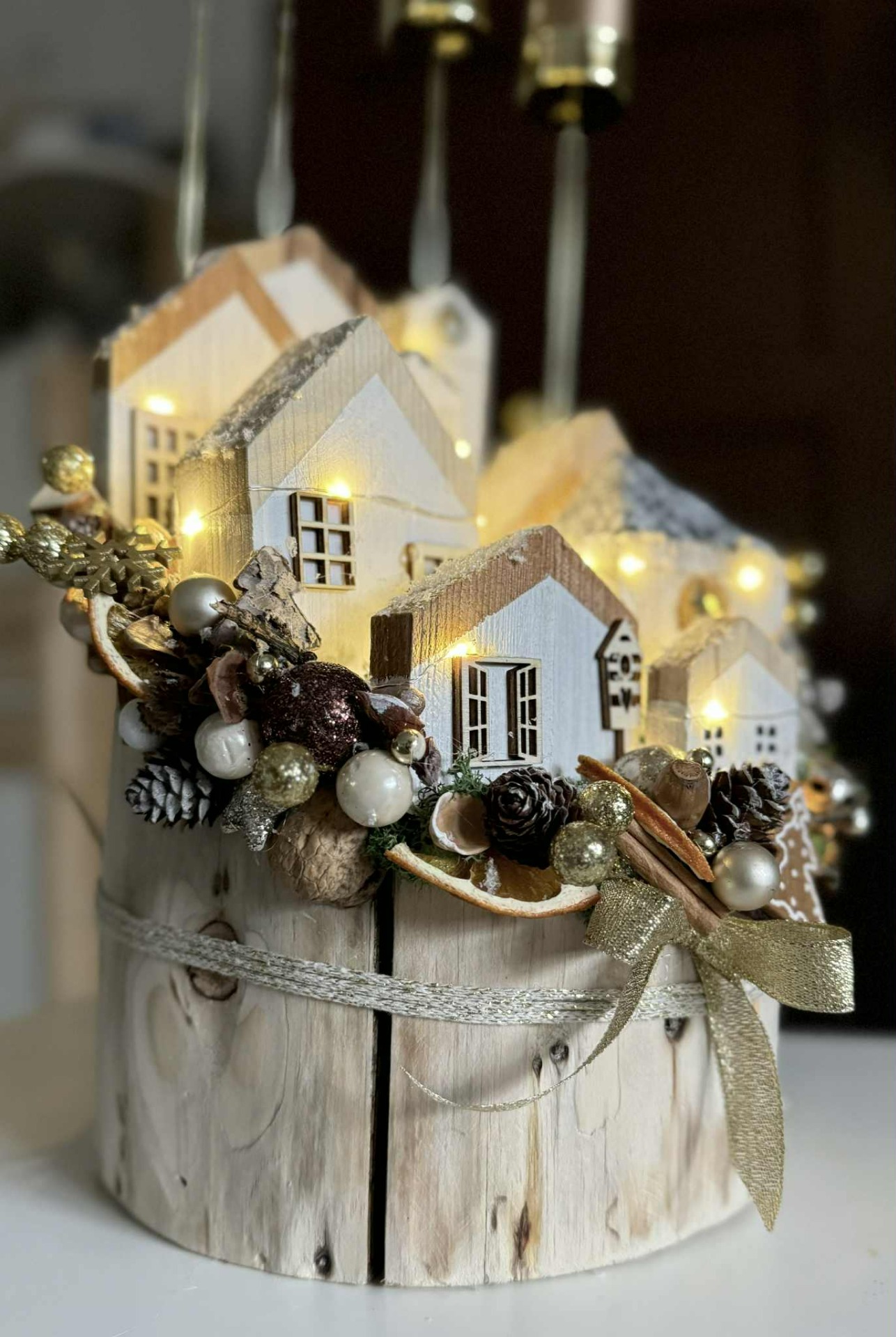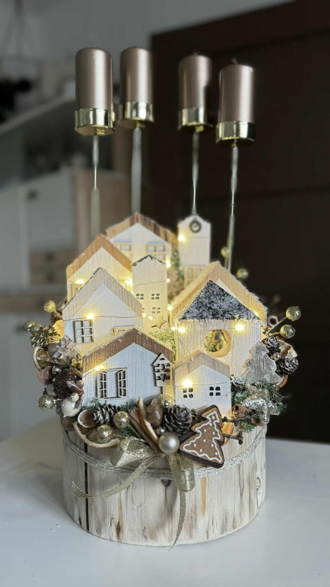 Vánoční svícen má výšku 45cm a šířka cca 25cm. Na vysokém, vyběleném špalku je usazeno 9 domečků se zvoničkou, které jsou doplněny vánočními přízdobami v hnědé a zlaté barvě, přírodními dekoracemi a světýlky. Dominantou jsou svíčky v hnědo-zlaté barvě, usazené do vysokých zlatých držáků.