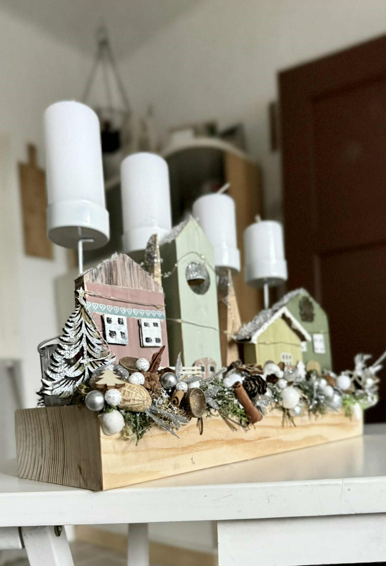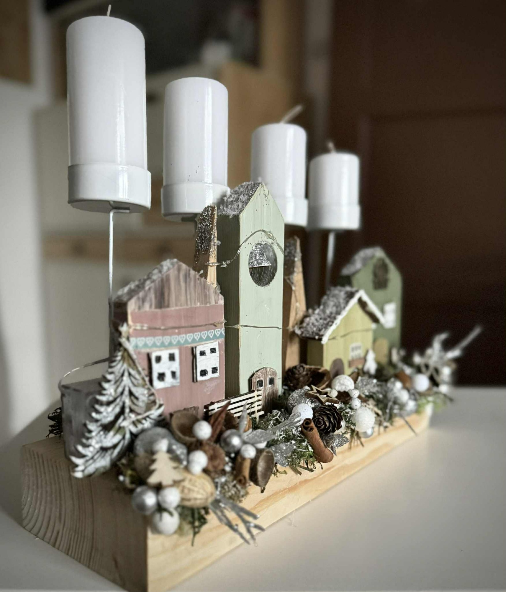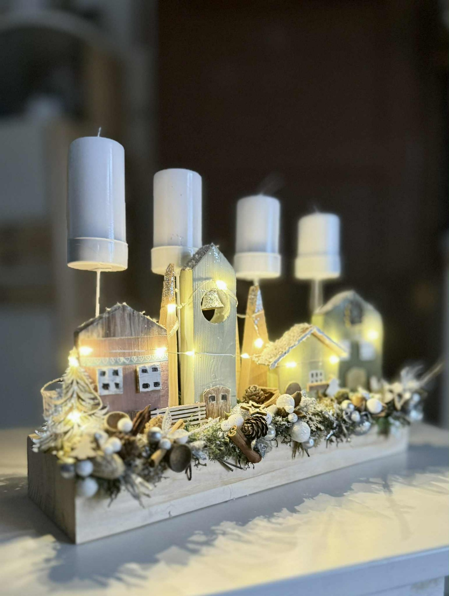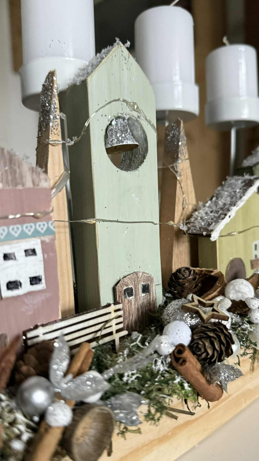 Na opracovaném, dřevěném trámku jsou usazeny domky mé výroby a zvonička, doplněny jsou vánočními přízdobami a světýlky.