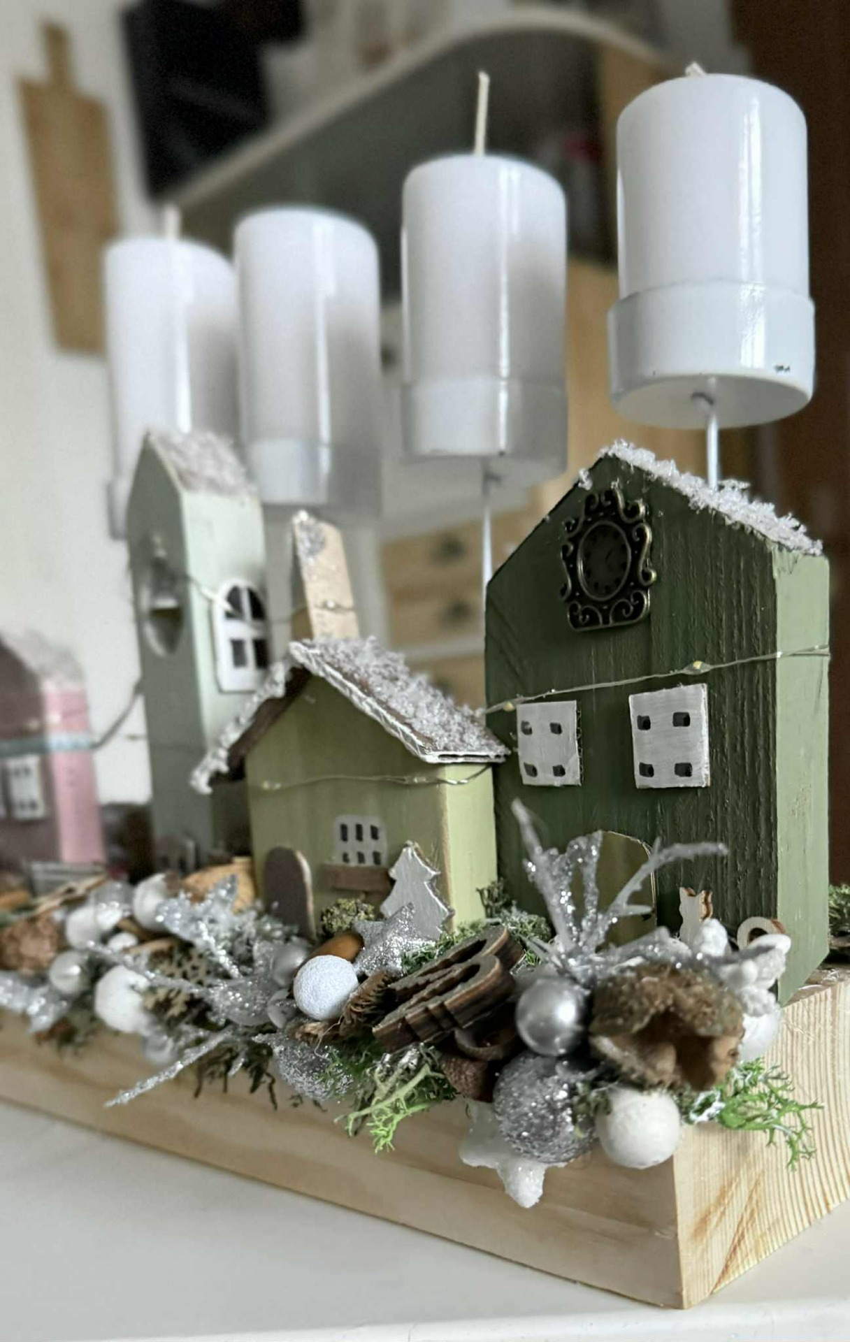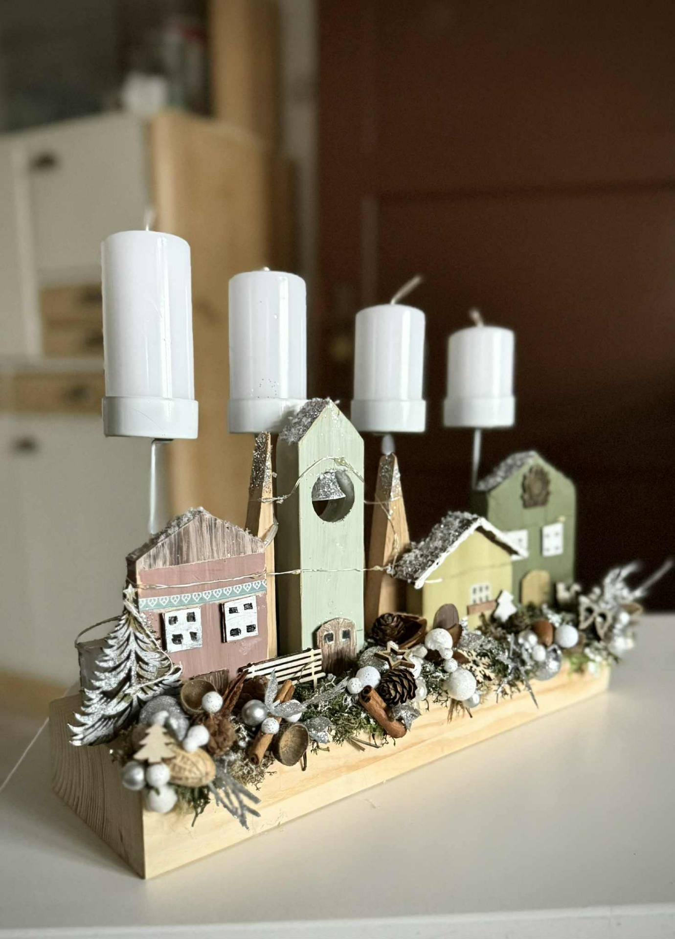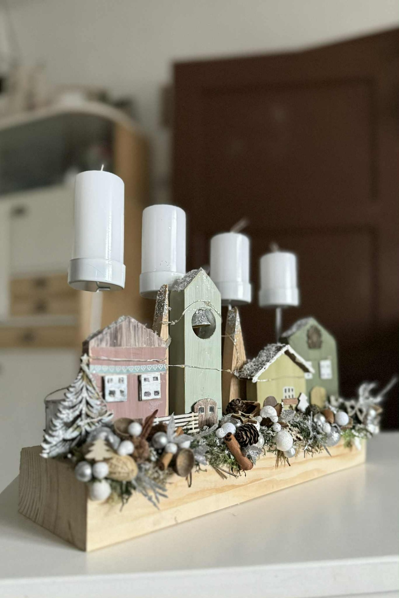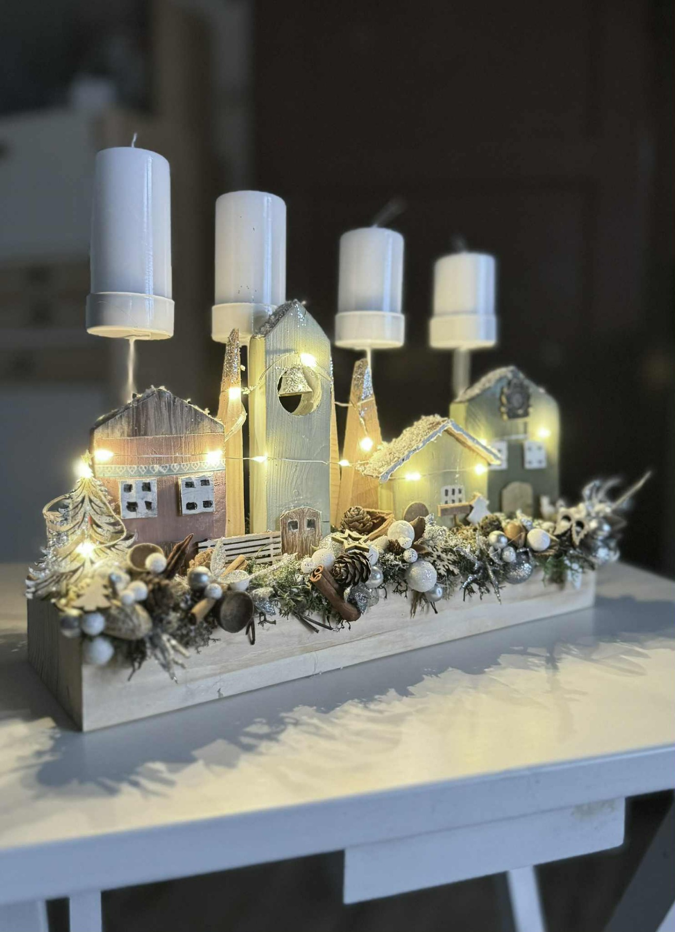 Na opracovaném, dřevěném trámku jsou usazeny domky mé výroby a zvonička, doplněny jsou vánočními přízdobami a světýlky.