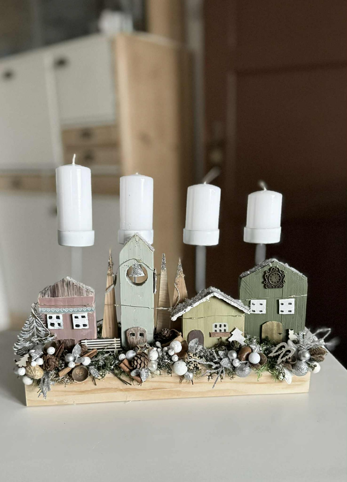 Vánoční svícen má délku 35cm a výšku 25cm, je tedy vhodný i na menší stoly, protože šetří místo.