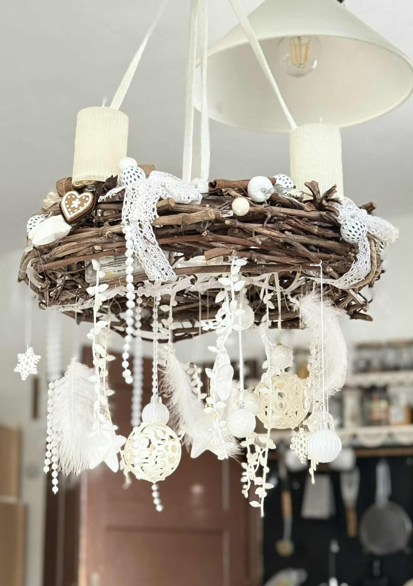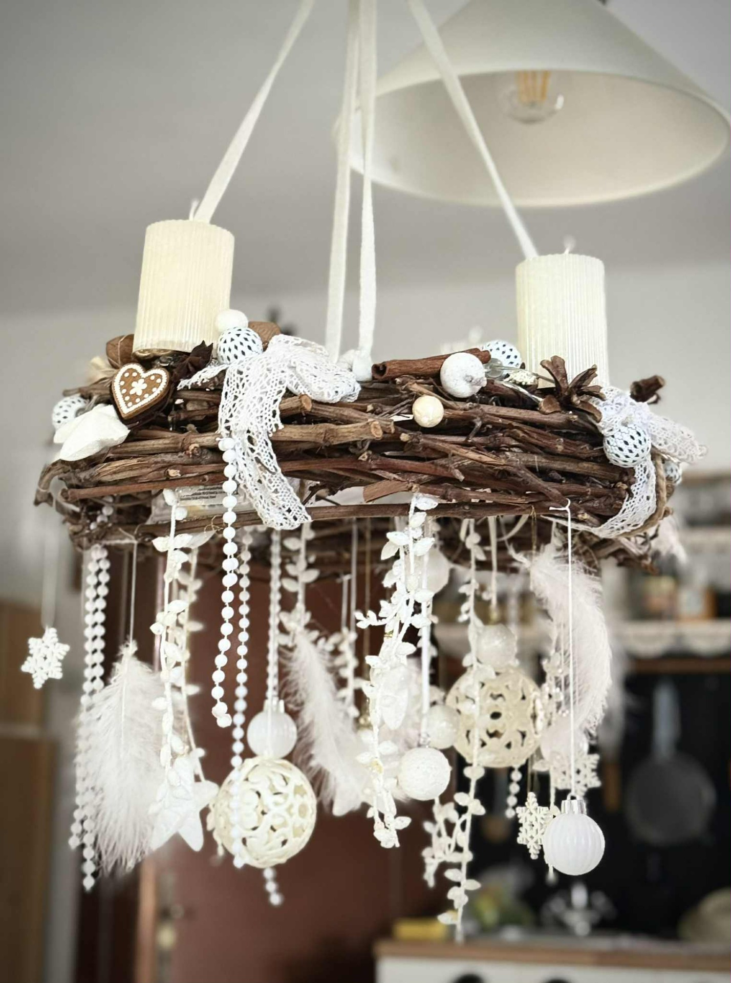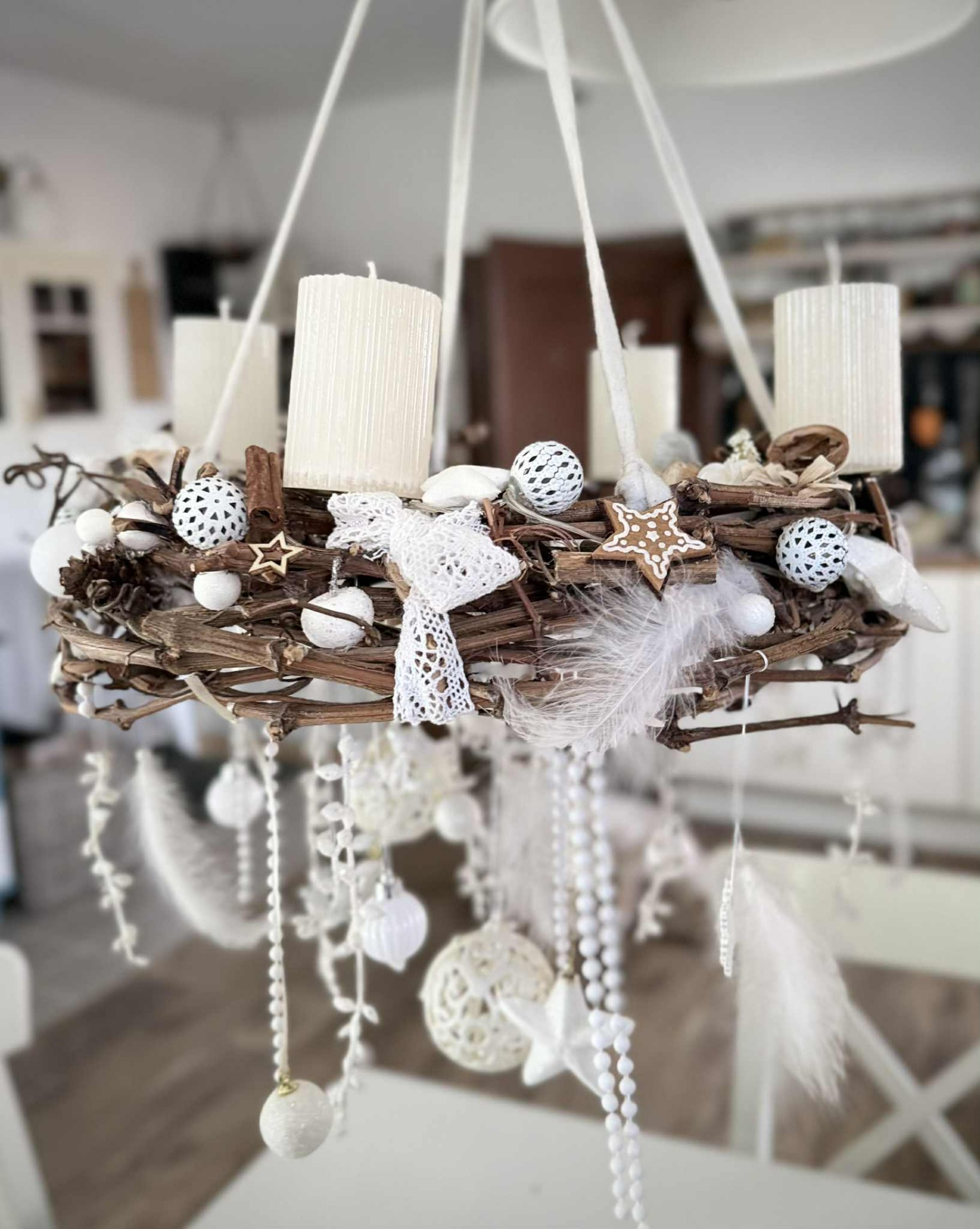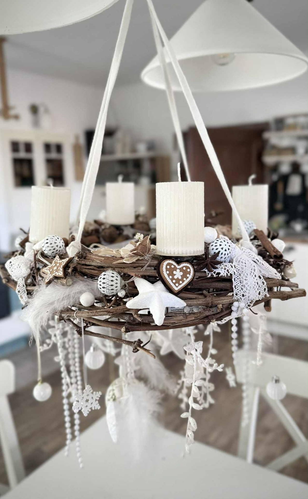 Závěsný adventní svícen na korpusu ze šlahounů z hroznového vína. Laděný do přírodního stylu v barvě bílé.