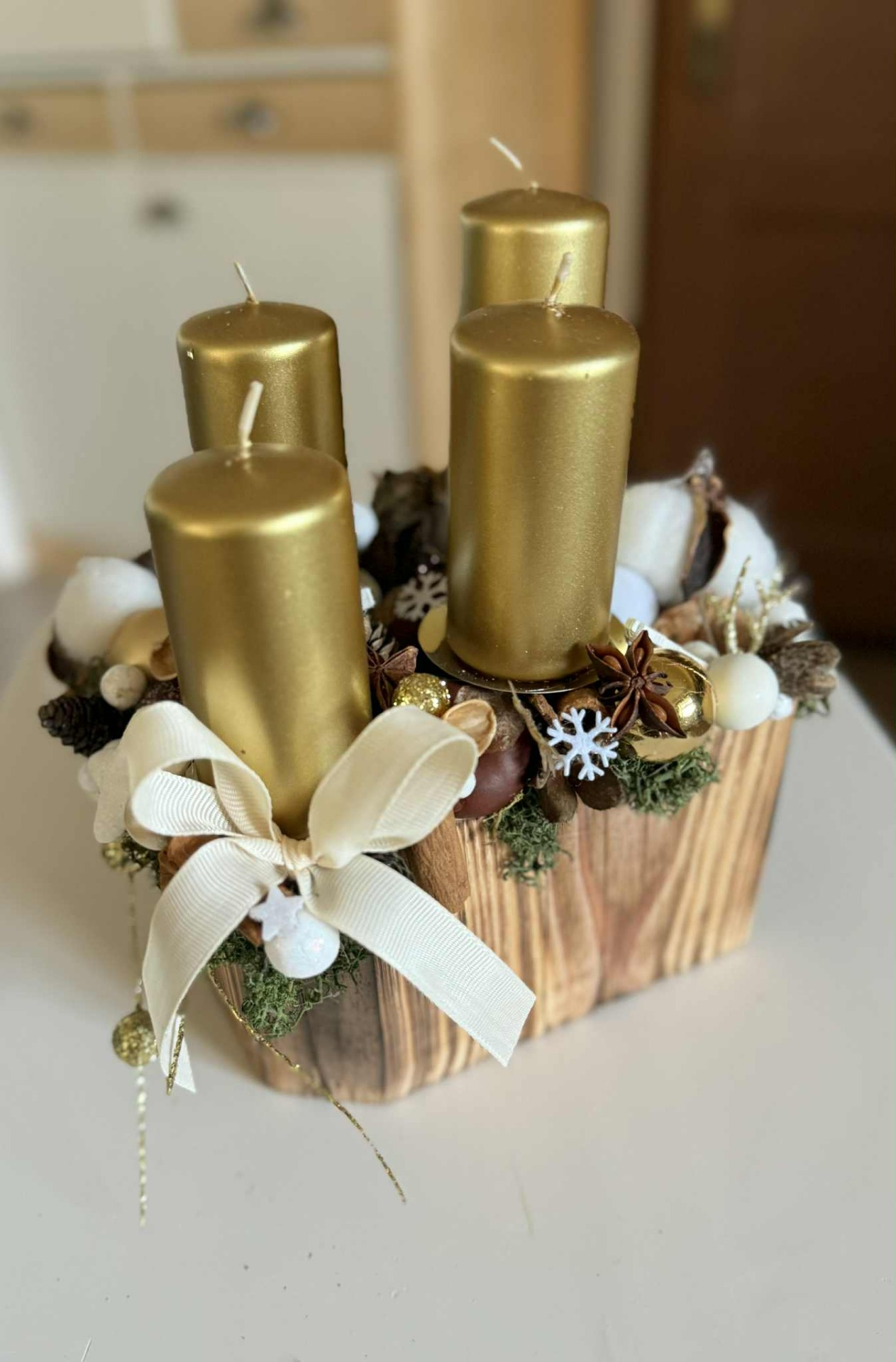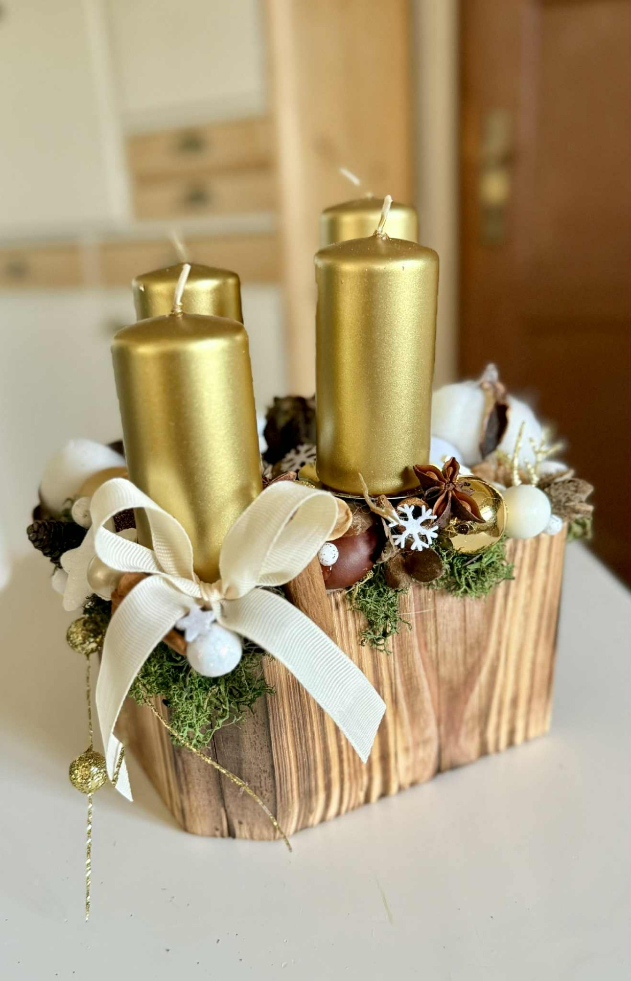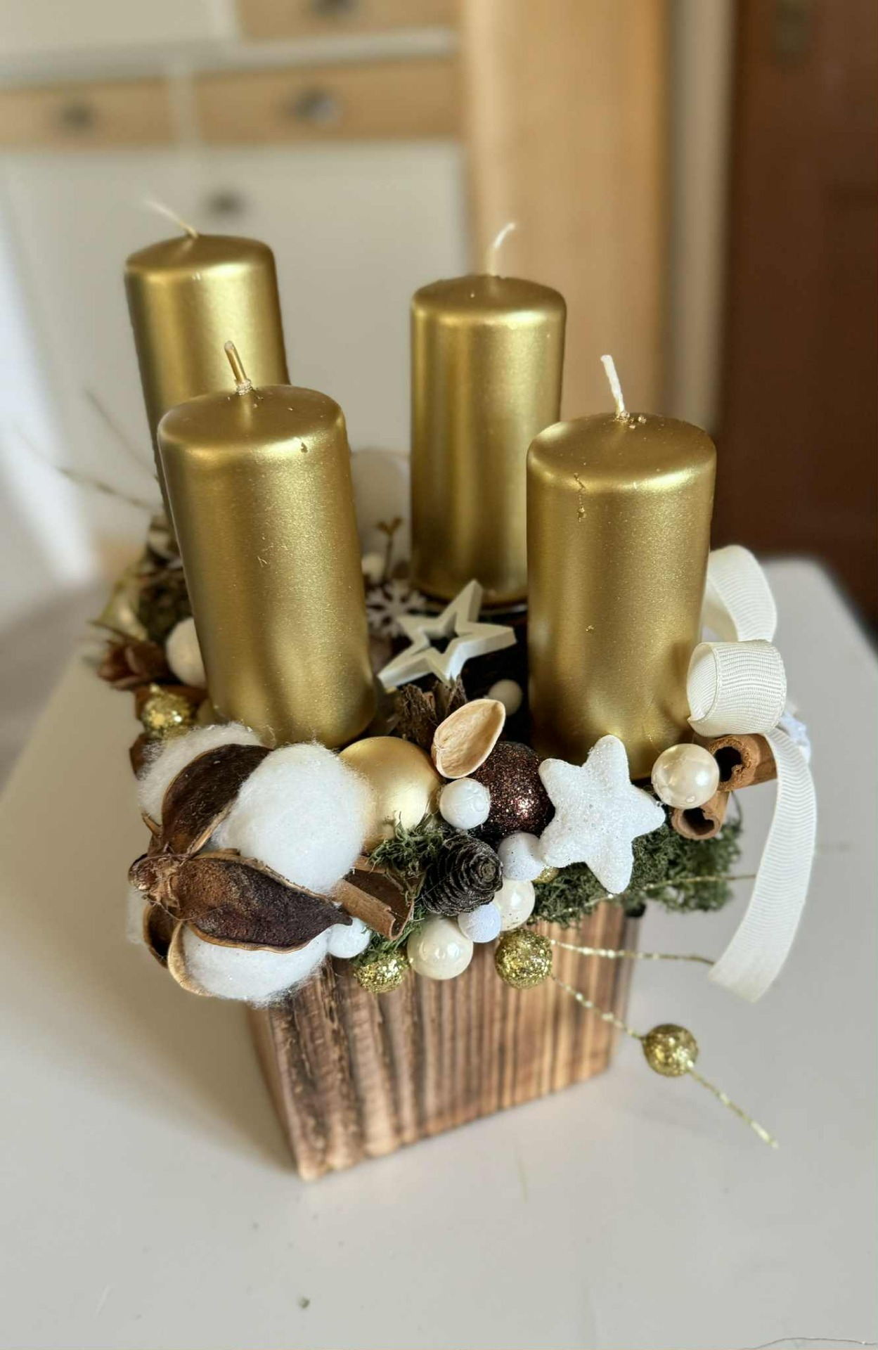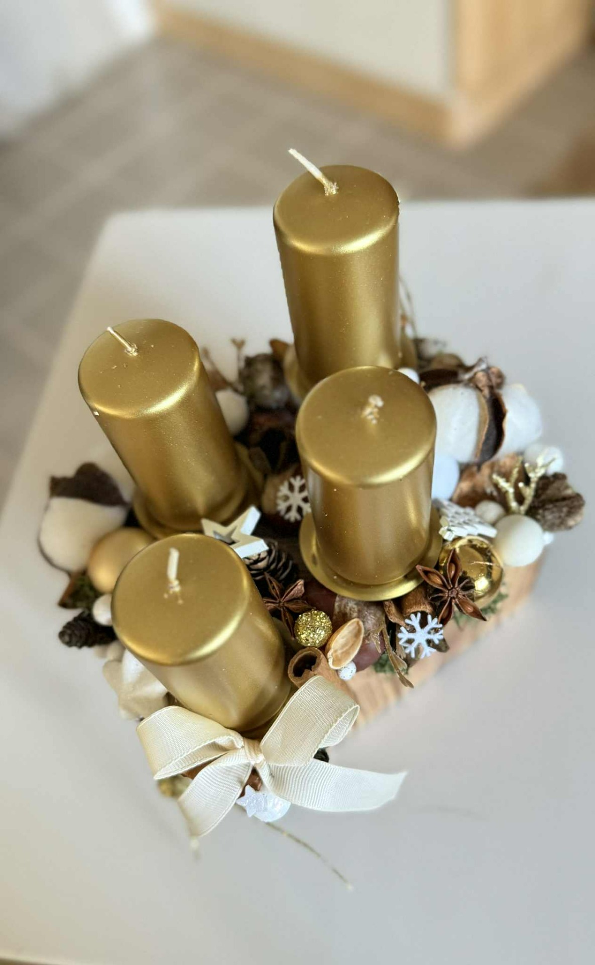 Adventní svícen v barvě bílé a zlaté. Zdoben je především přírodními dekoracemi, doladěn vánočními přízdobami.