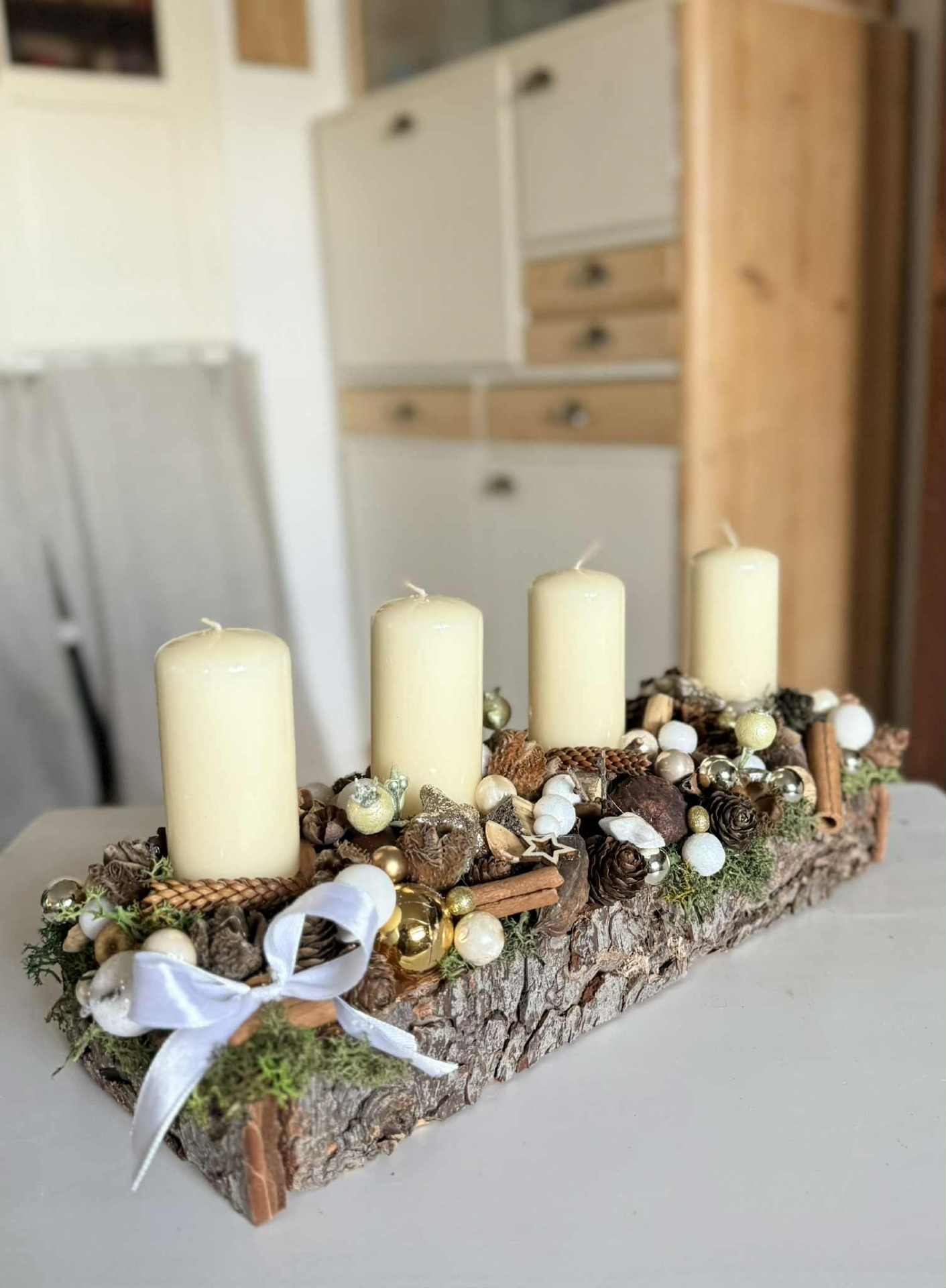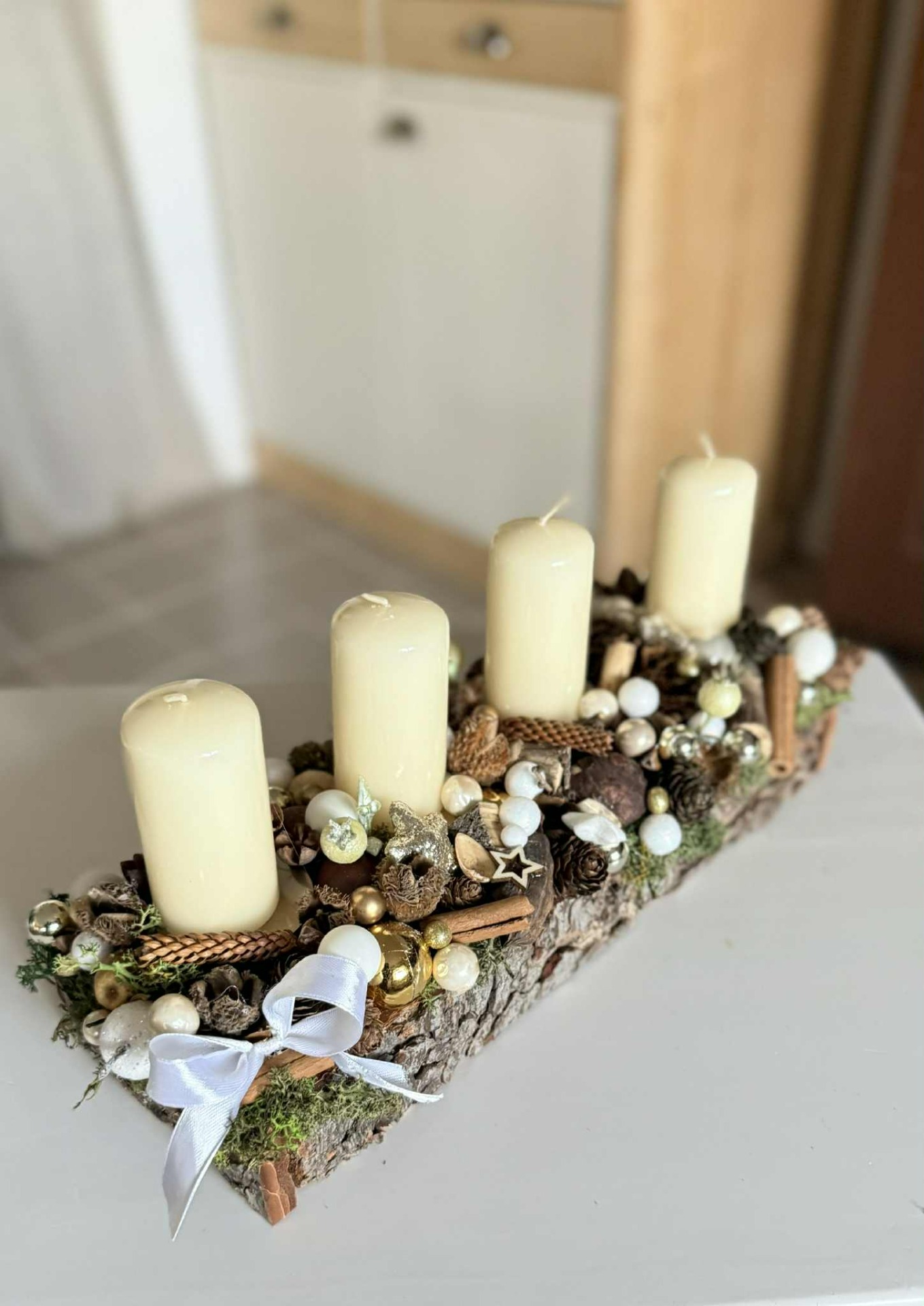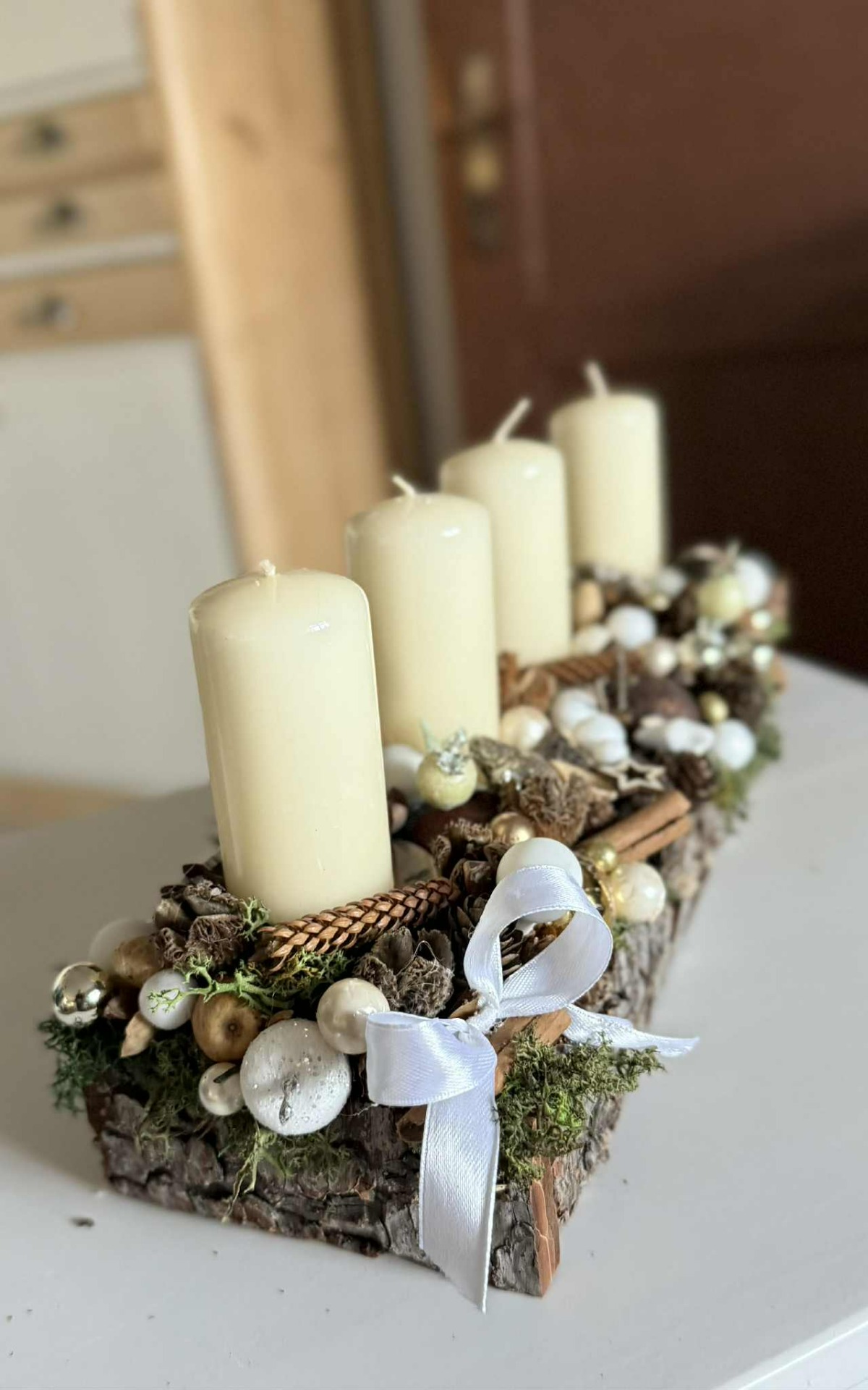 Na trámku zdobeném kůrou jsou umístěny svíčky ve smetanové barvě.