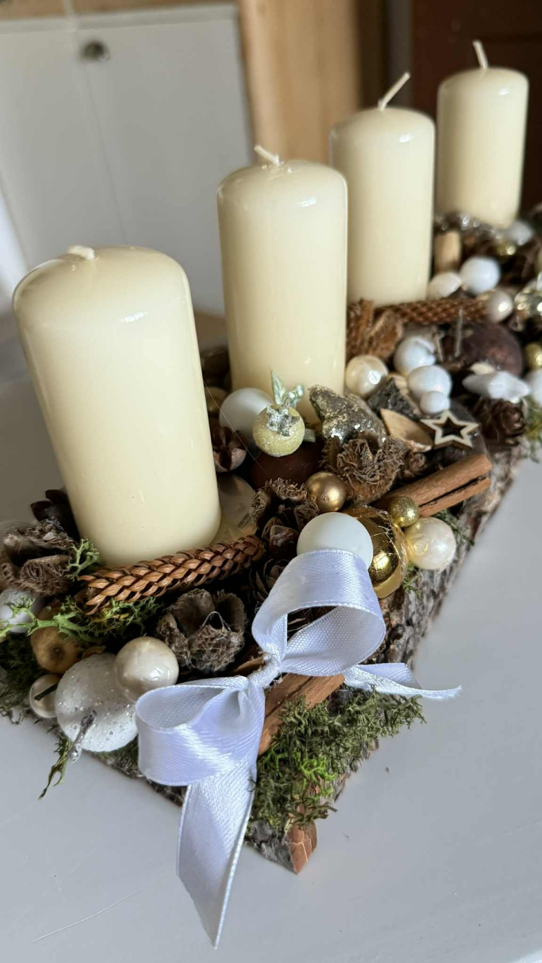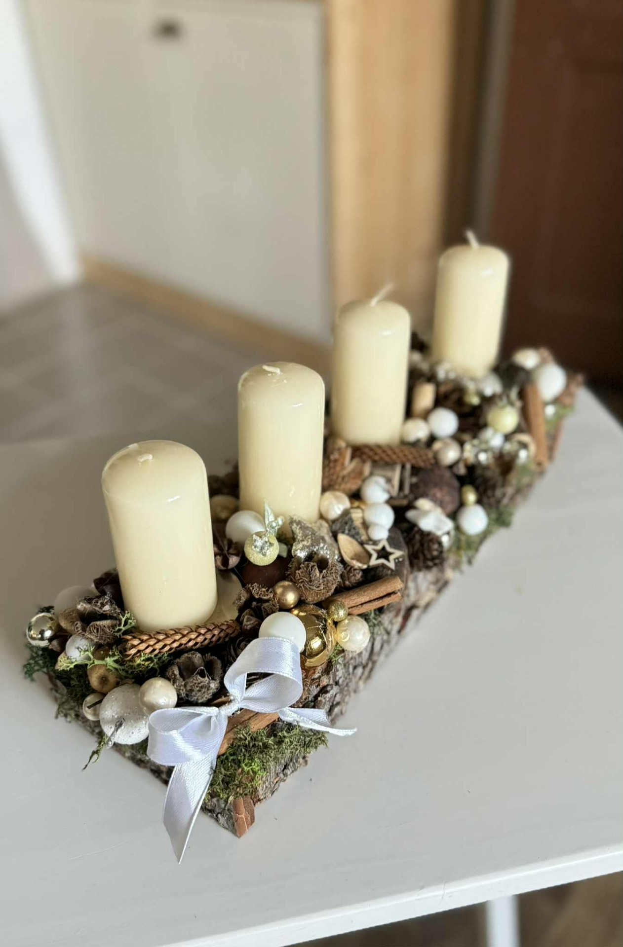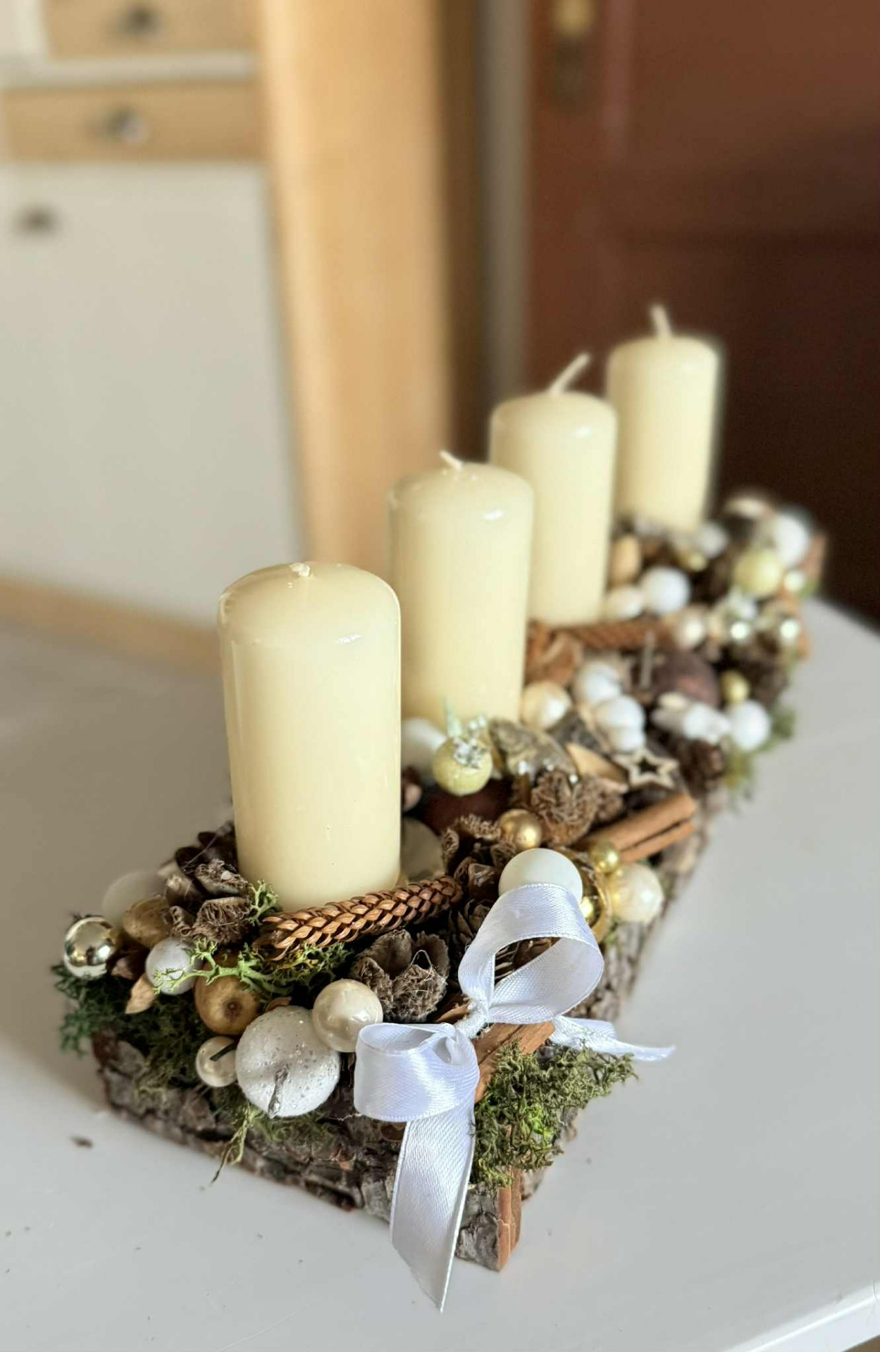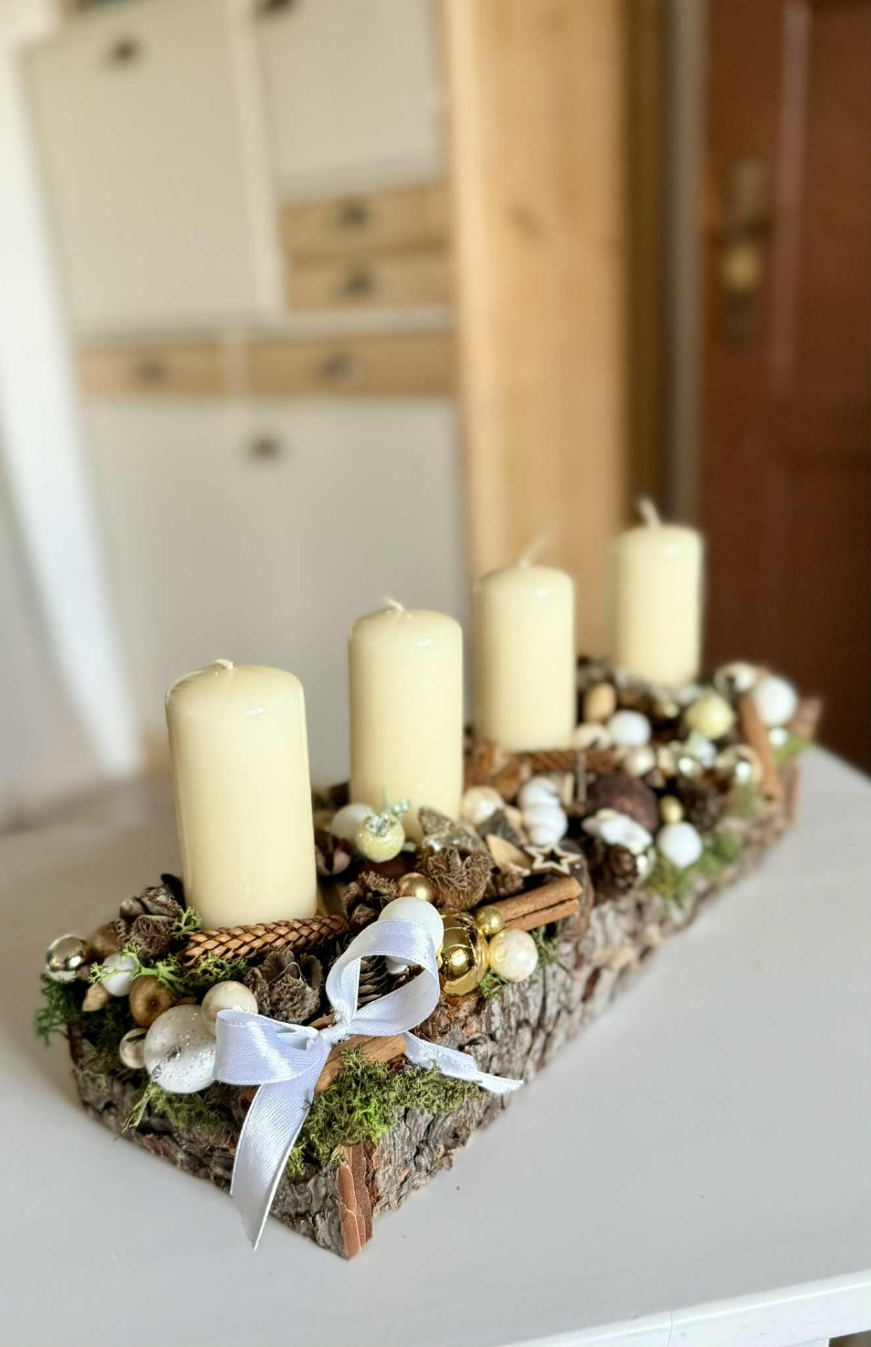Tento adventní svícen má šířku 15 cm a délku cca 35 cm, díky tomu je vhodný i na menší stoly, protože šetří místo.