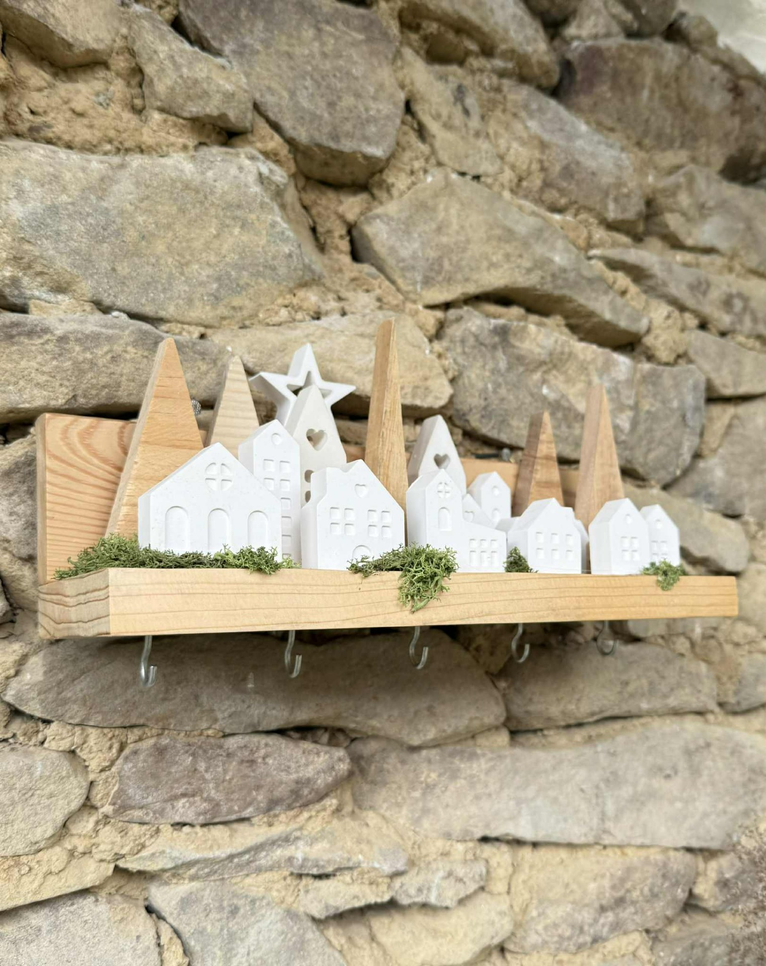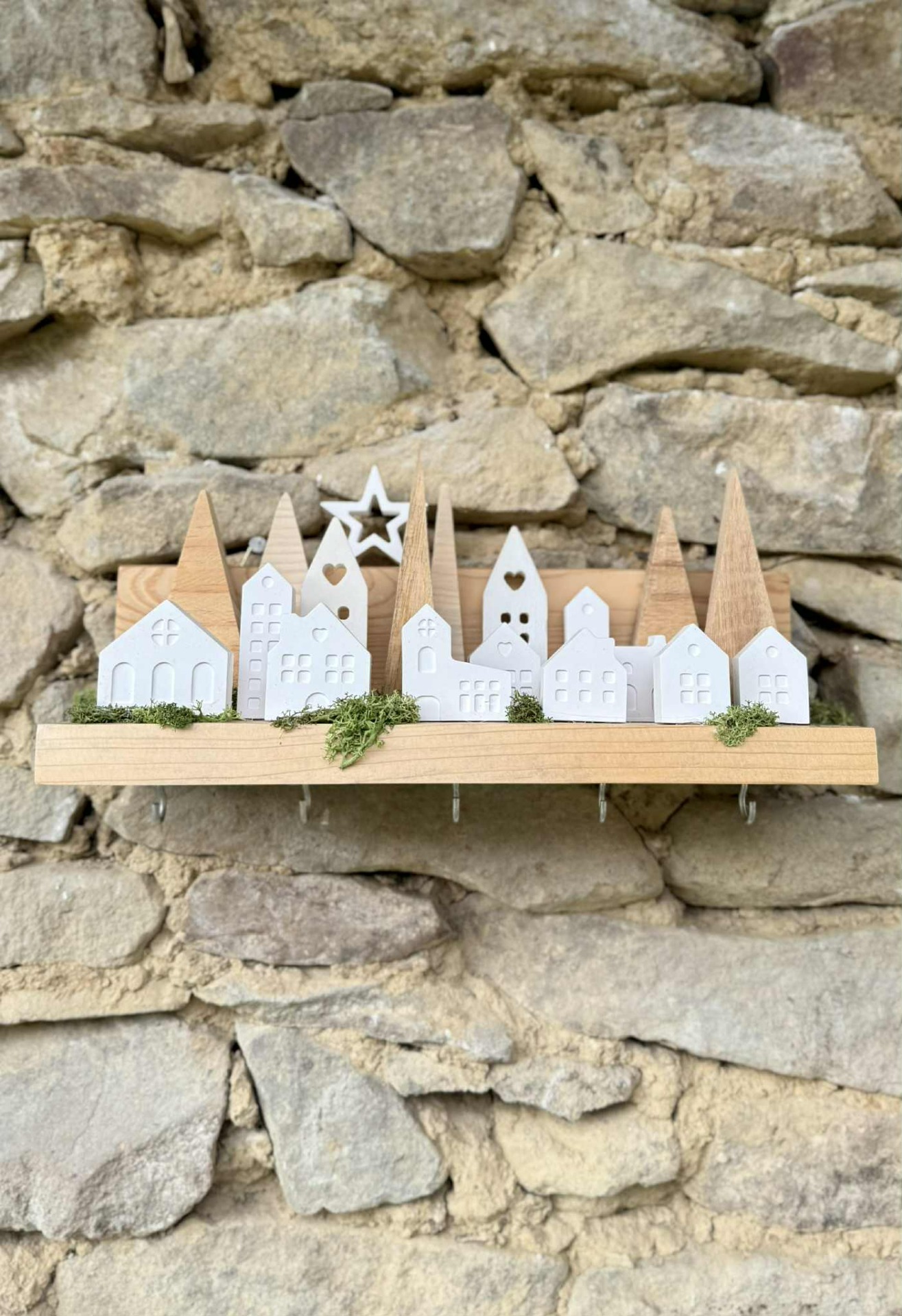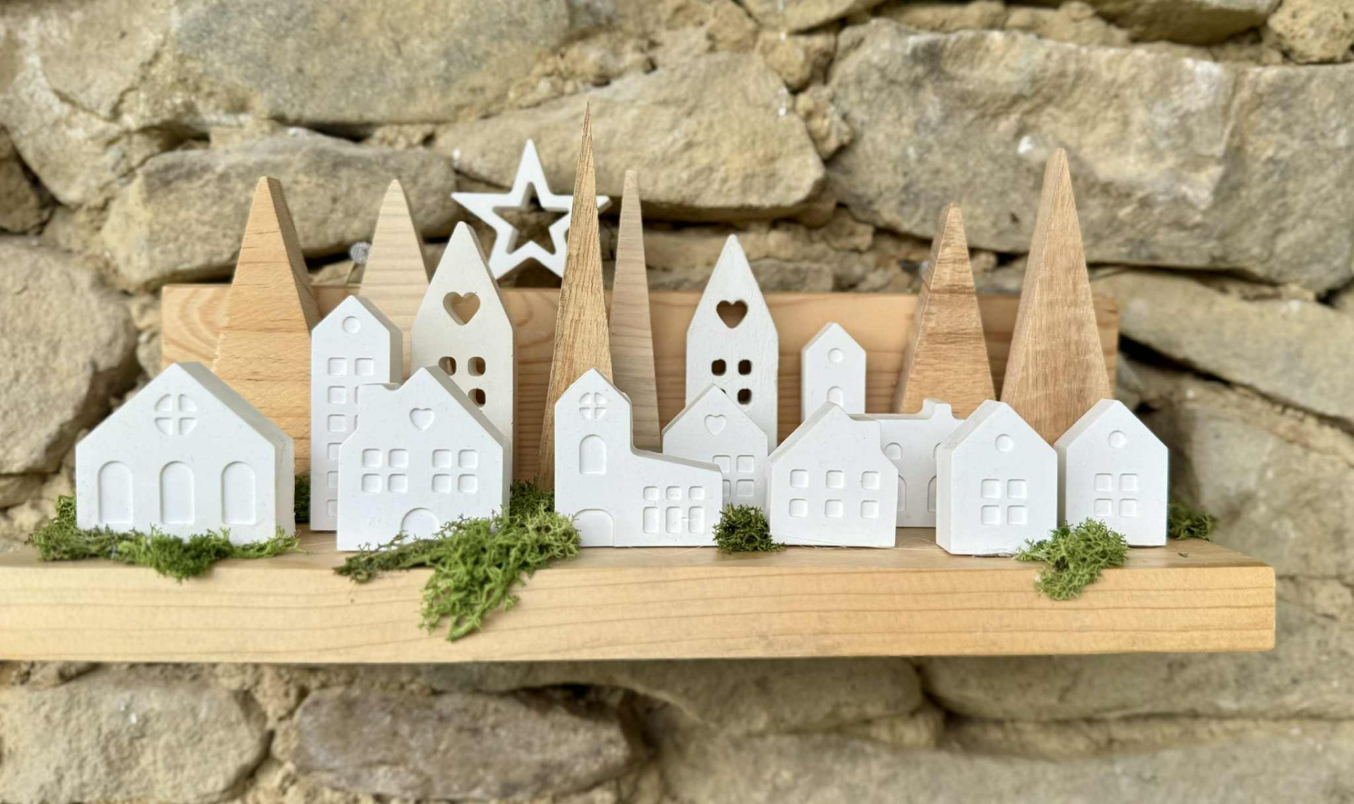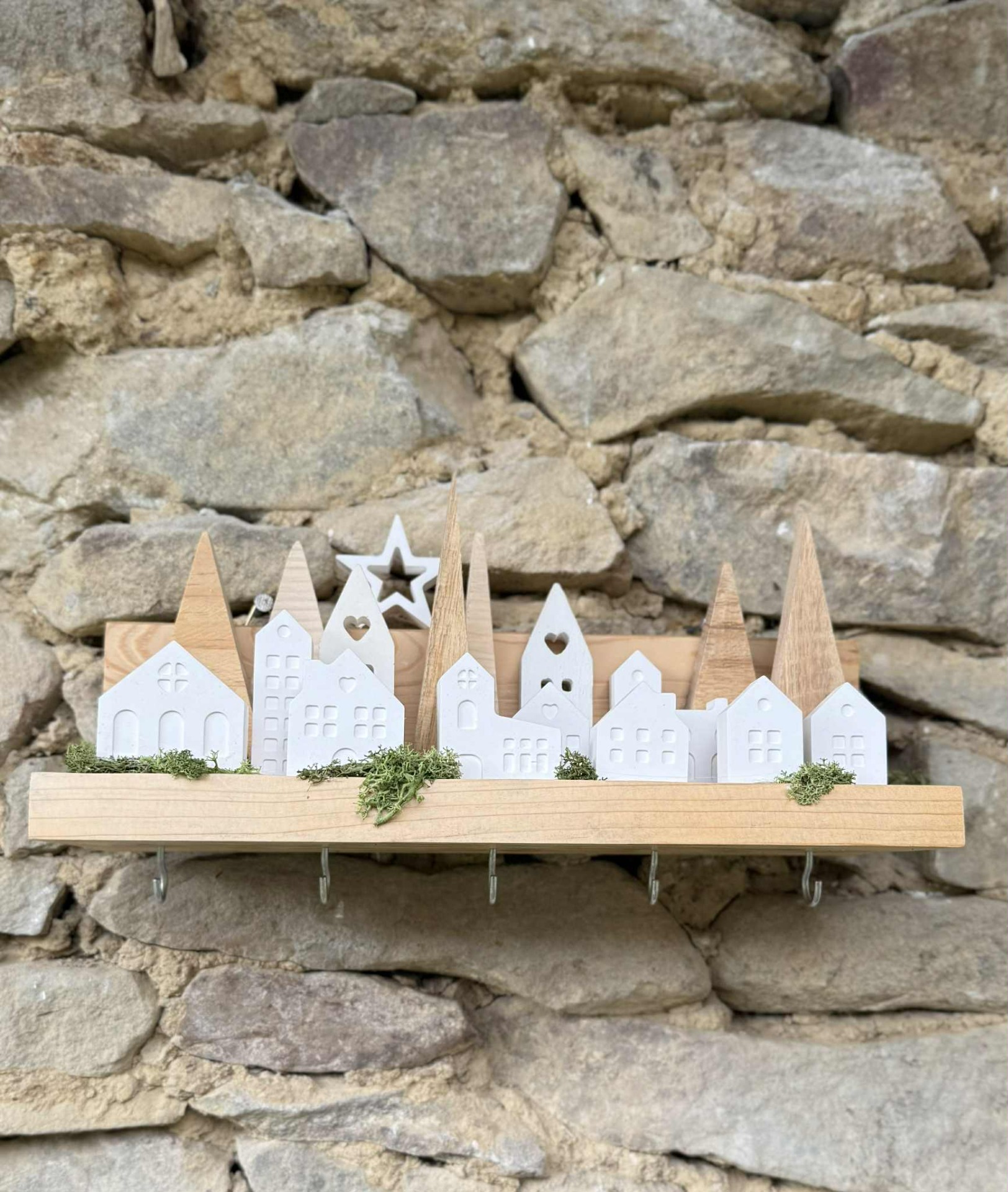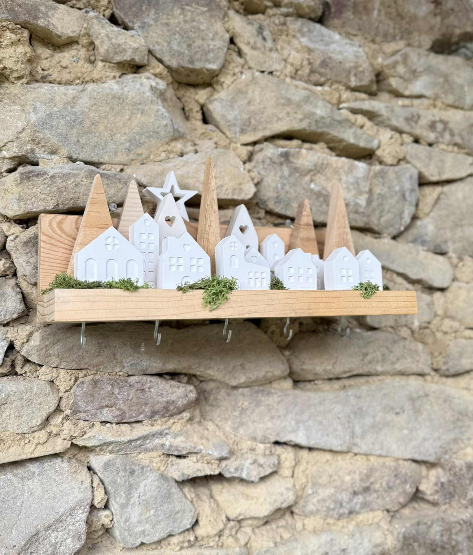 Je vyroben z dubového dřeva v přírodním odstínu a na něm stojí 11 odlévaných domečků a další dekorace, tak, aby vytvořily příjemnou uličku.