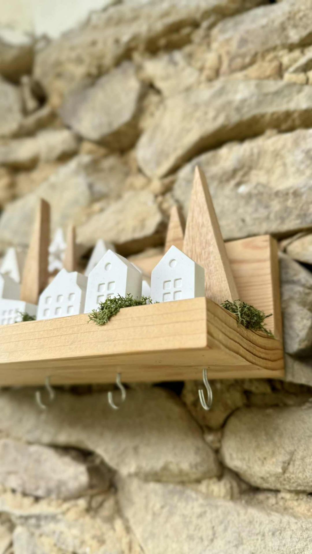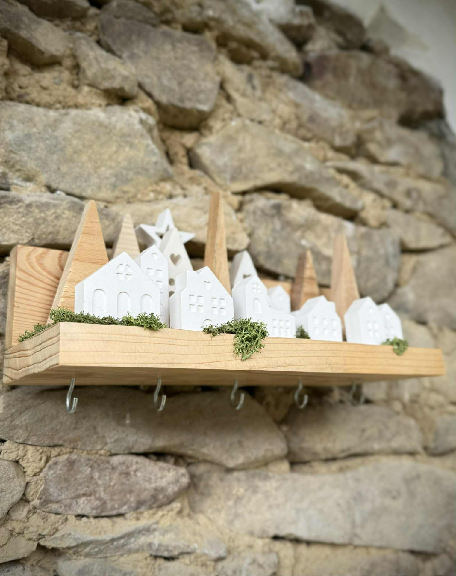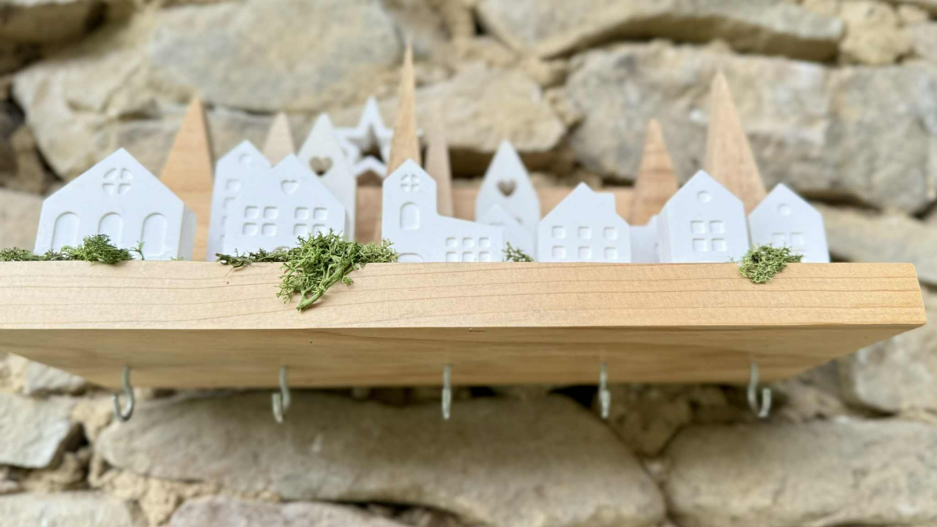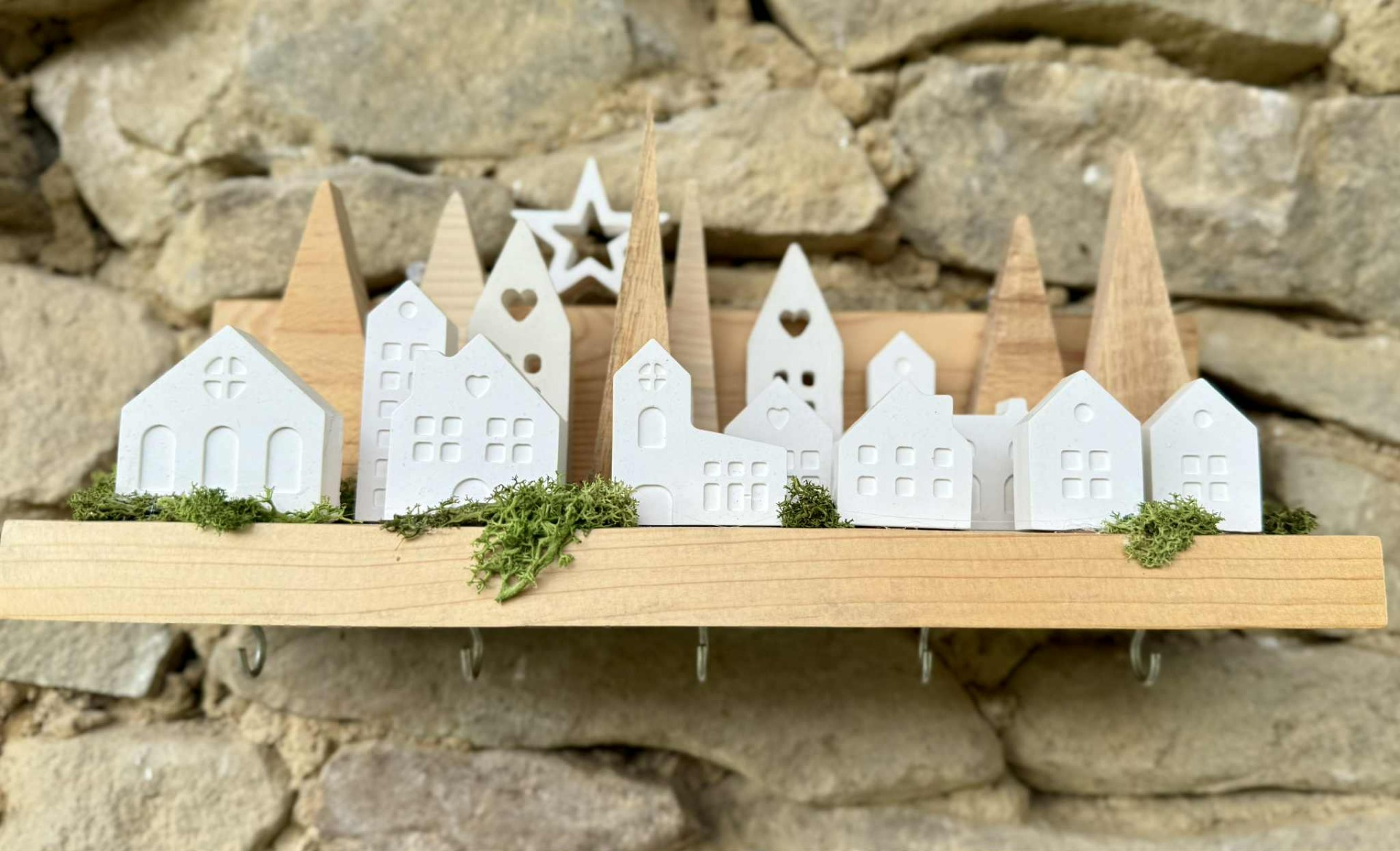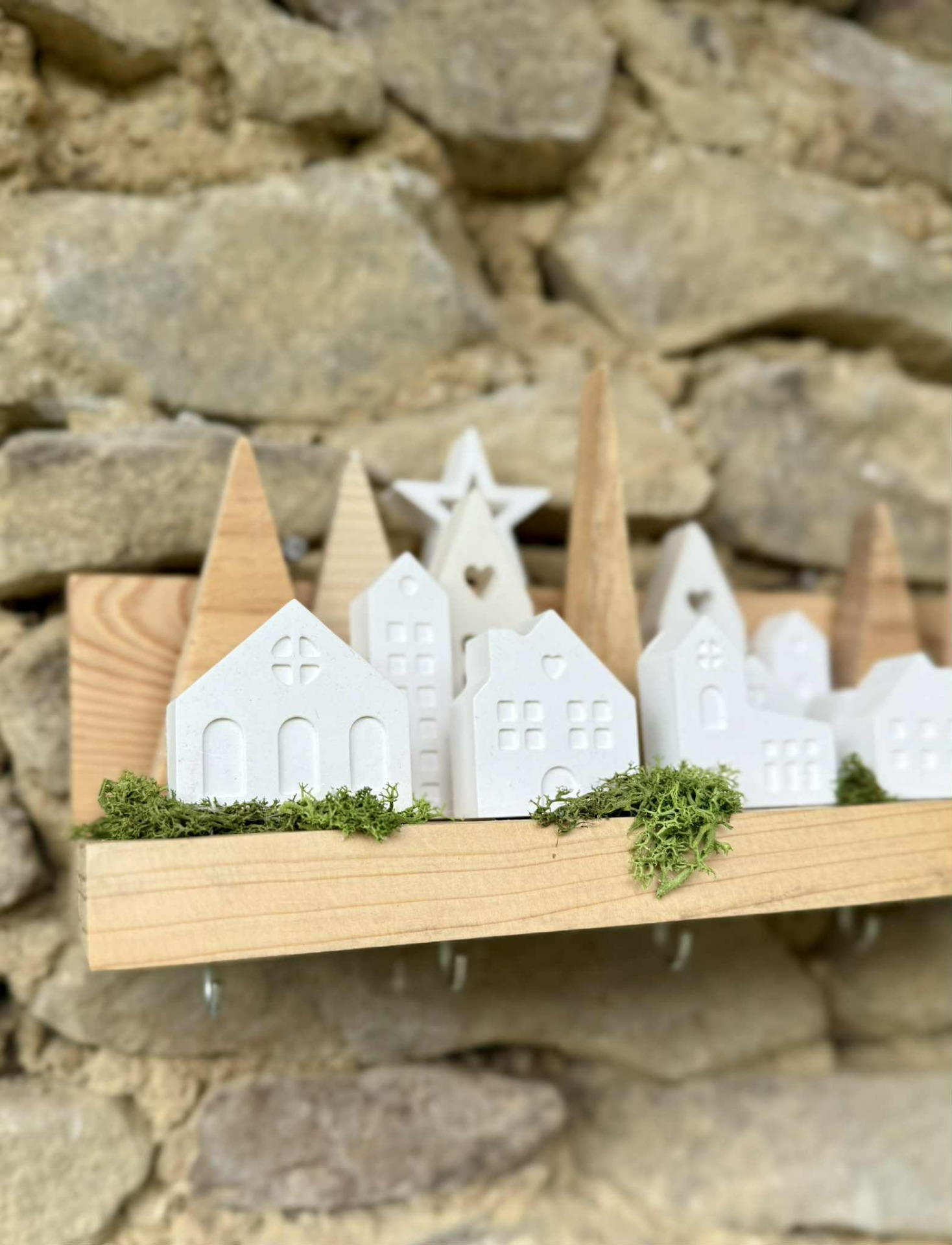 Je vyroben z dubového dřeva v přírodním odstínu a na něm stojí 11 odlévaných domečků a další dekorace, tak, aby vytvořily příjemnou uličku.