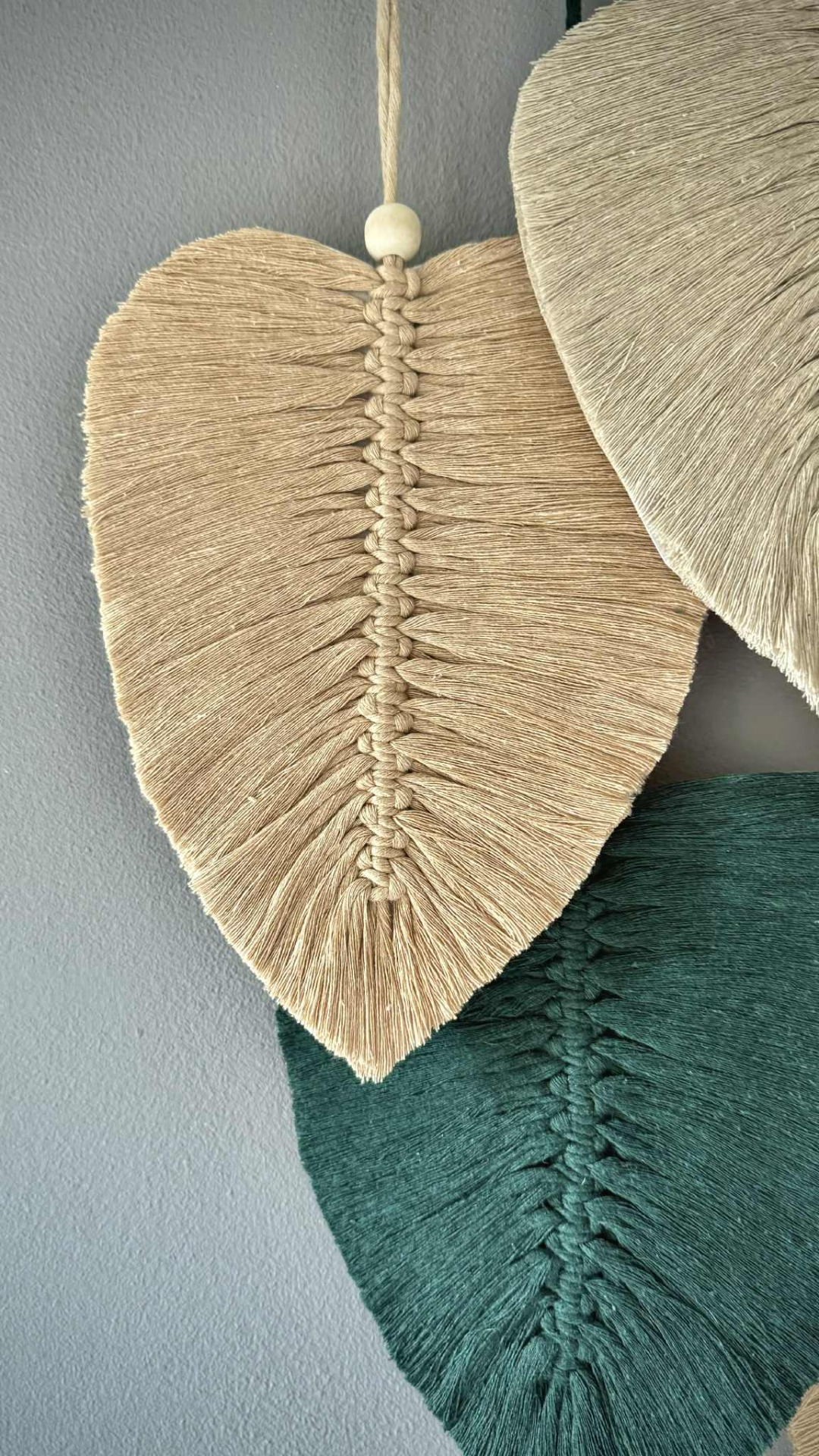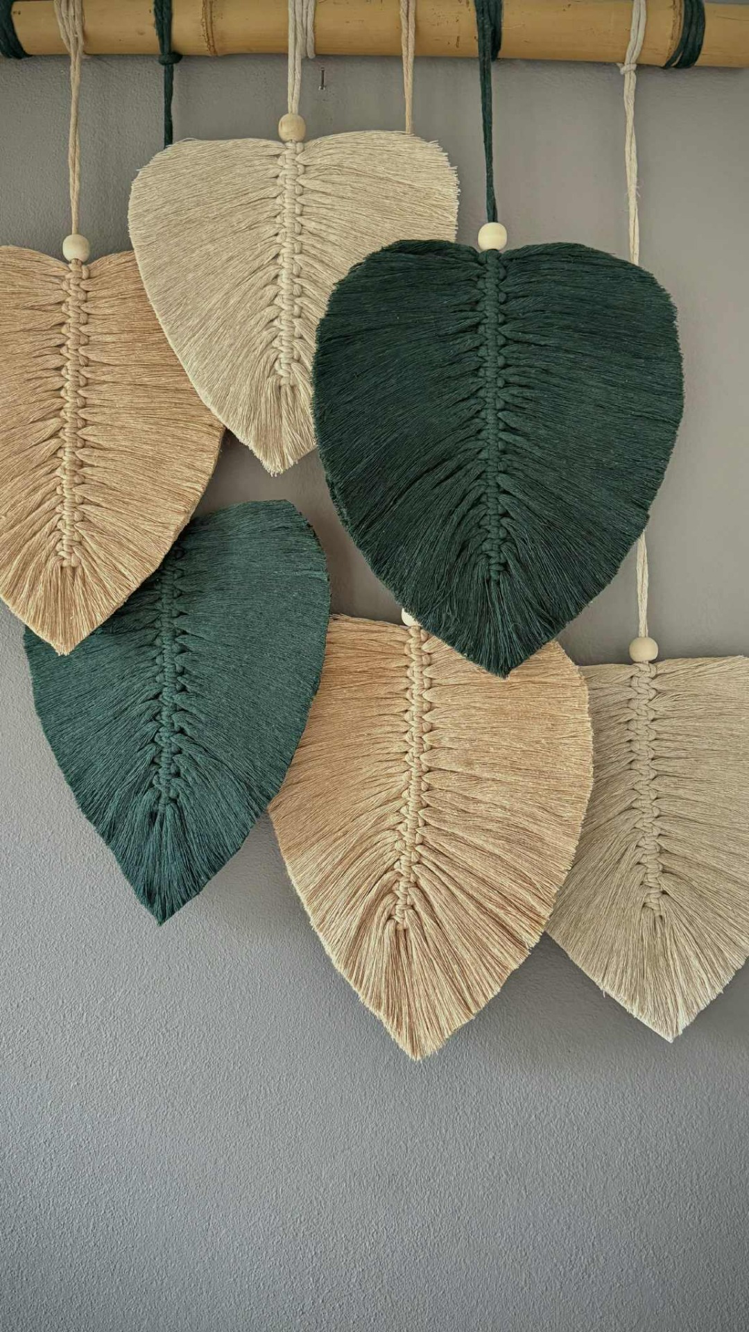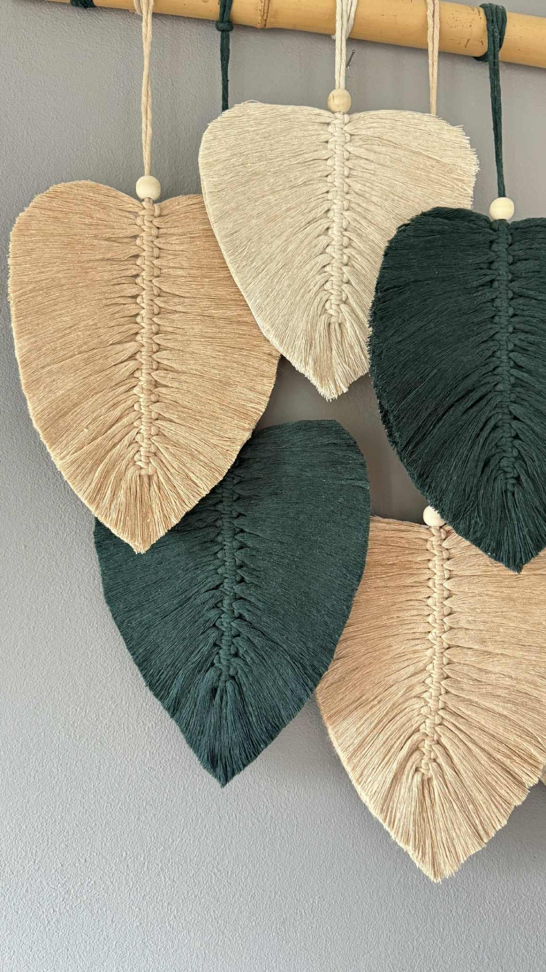 Závěs je vyroben technikou drhání/macramé v tmavě zelené a odstínech mocca a béžové barvy.