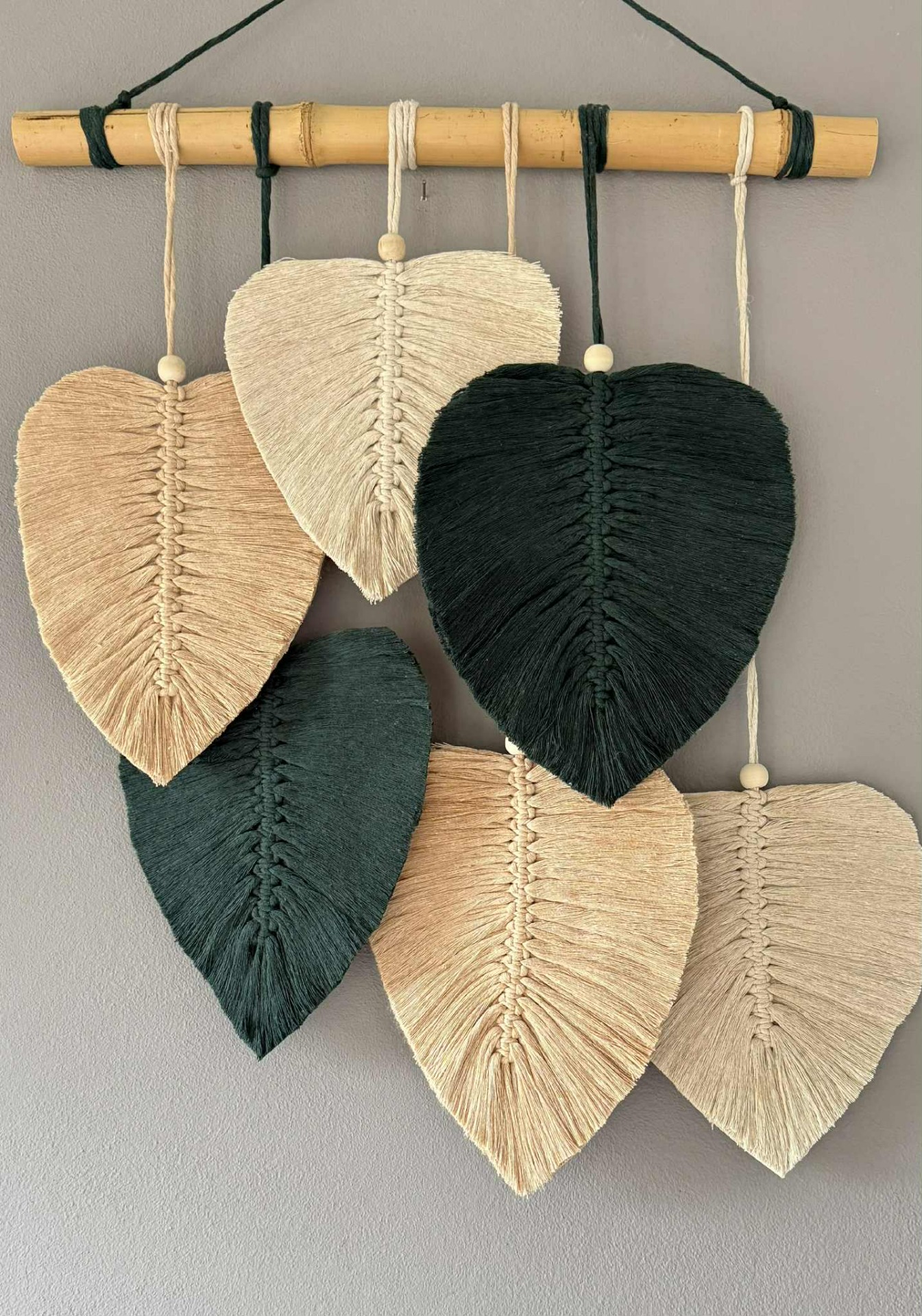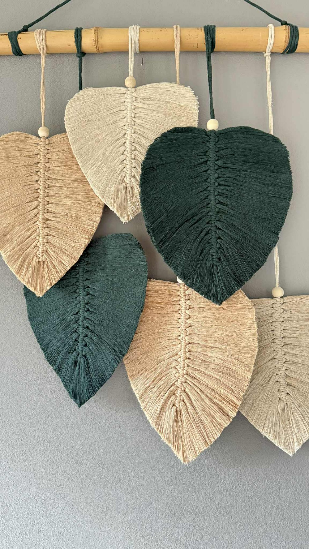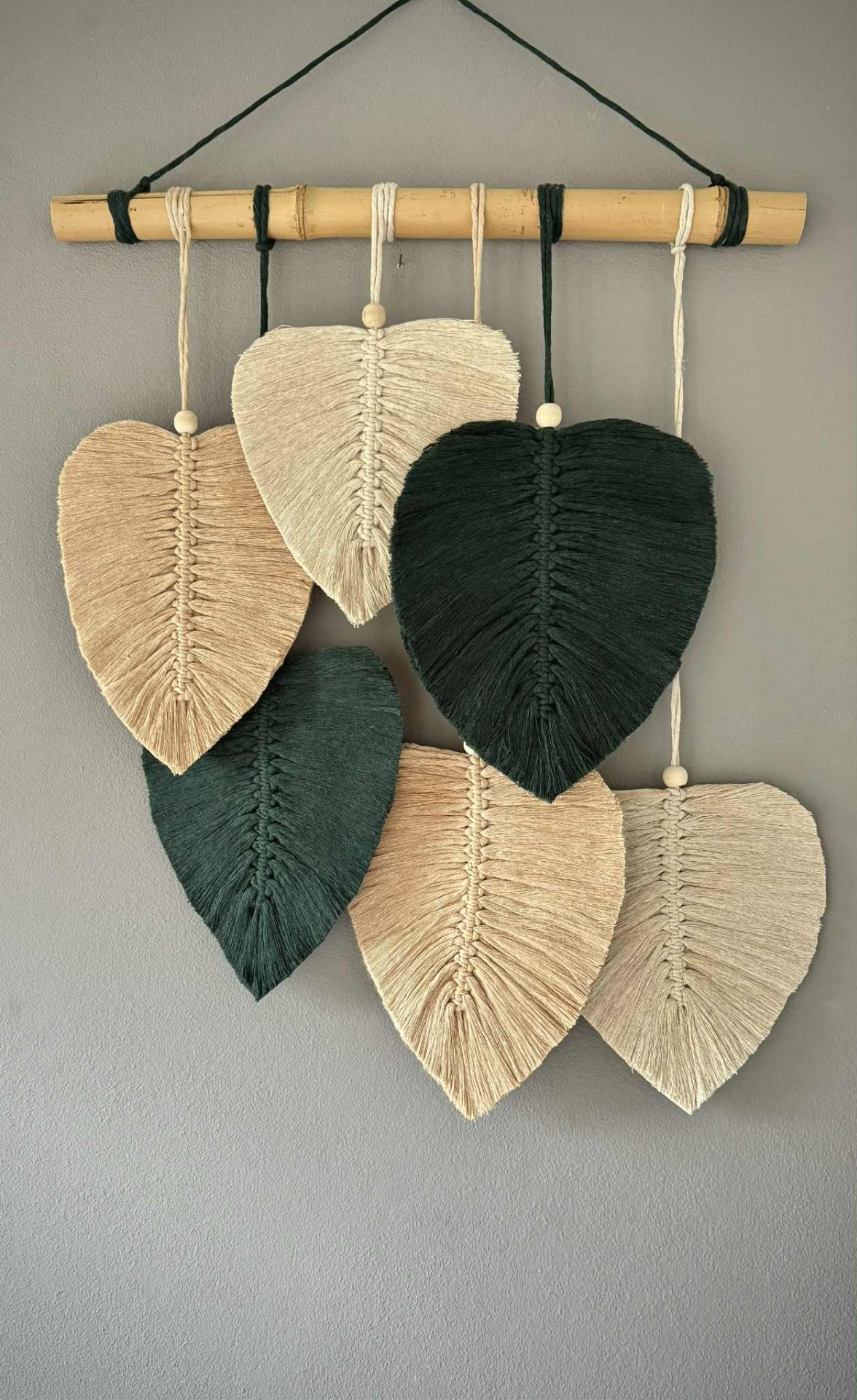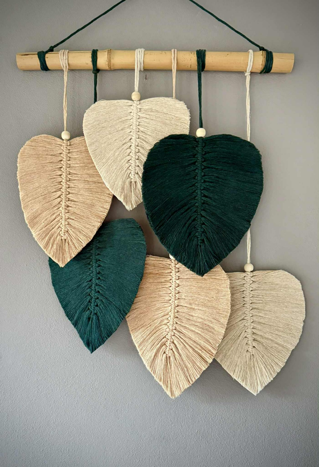 Závěs je vyroben technikou drhání/macramé v tmavě zelené a odstínech mocca a béžové barvy.