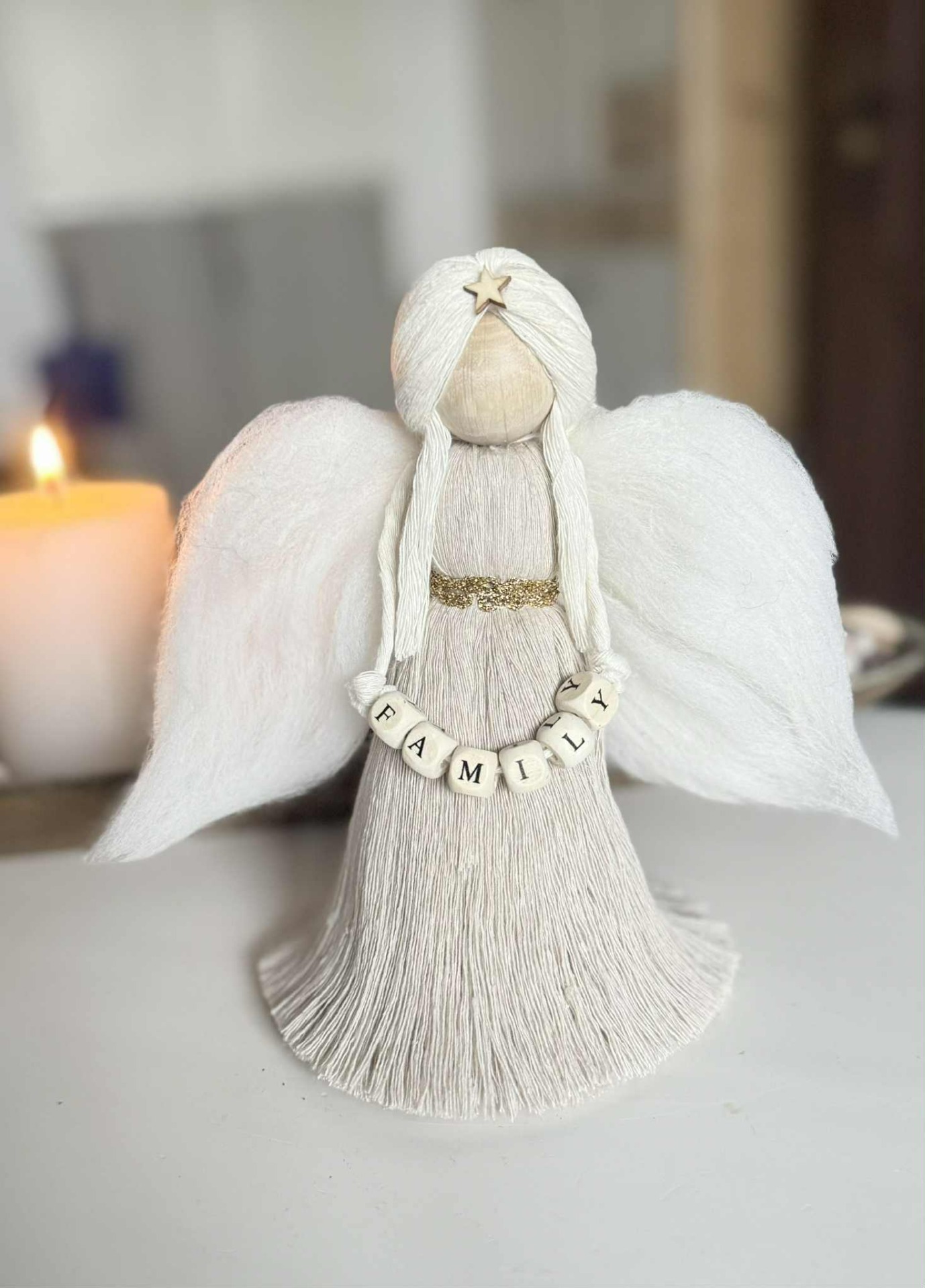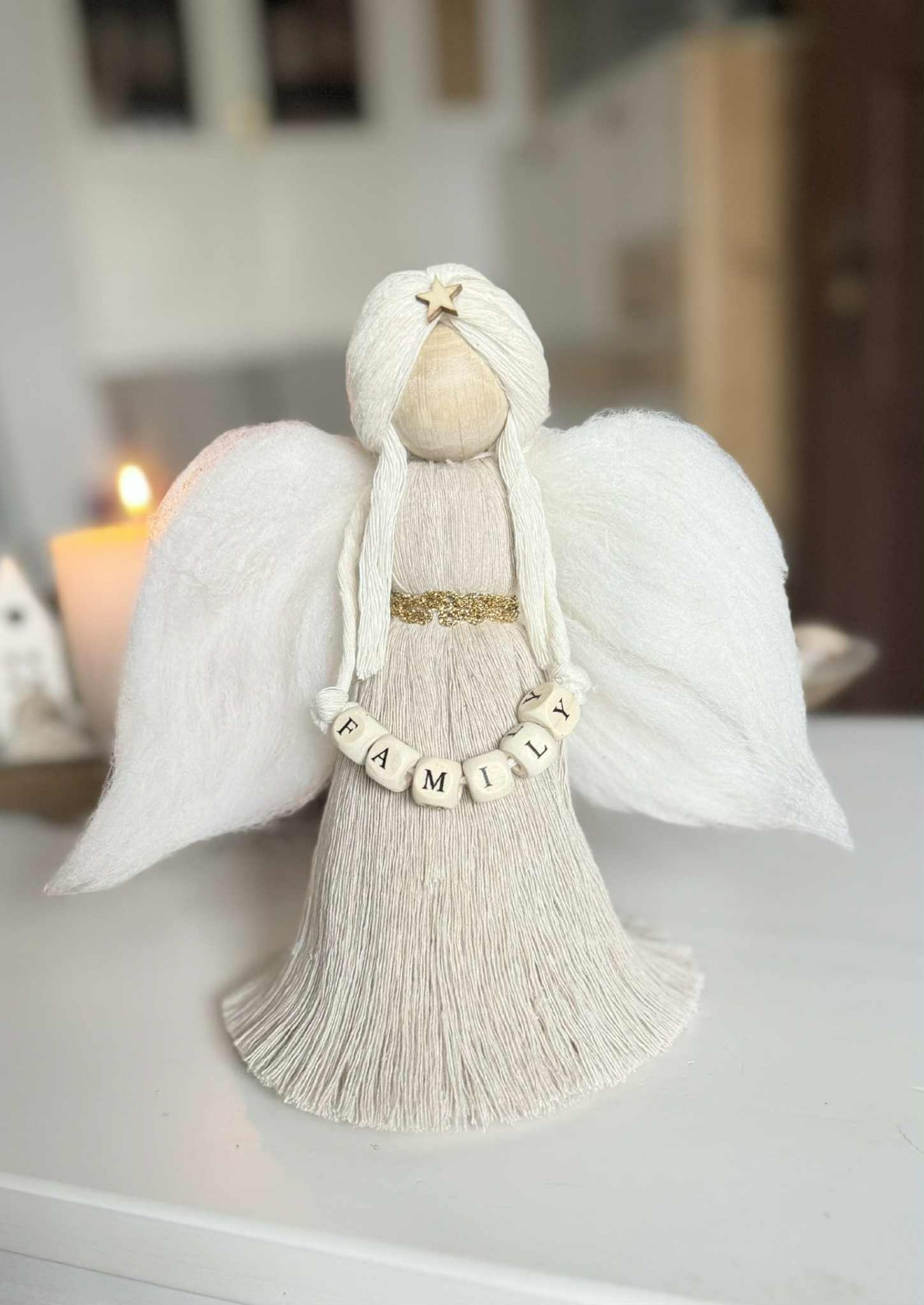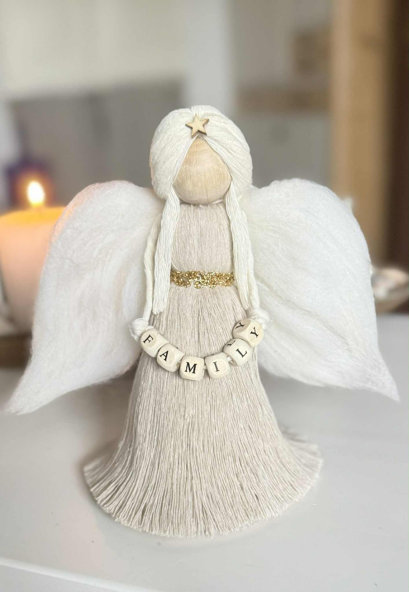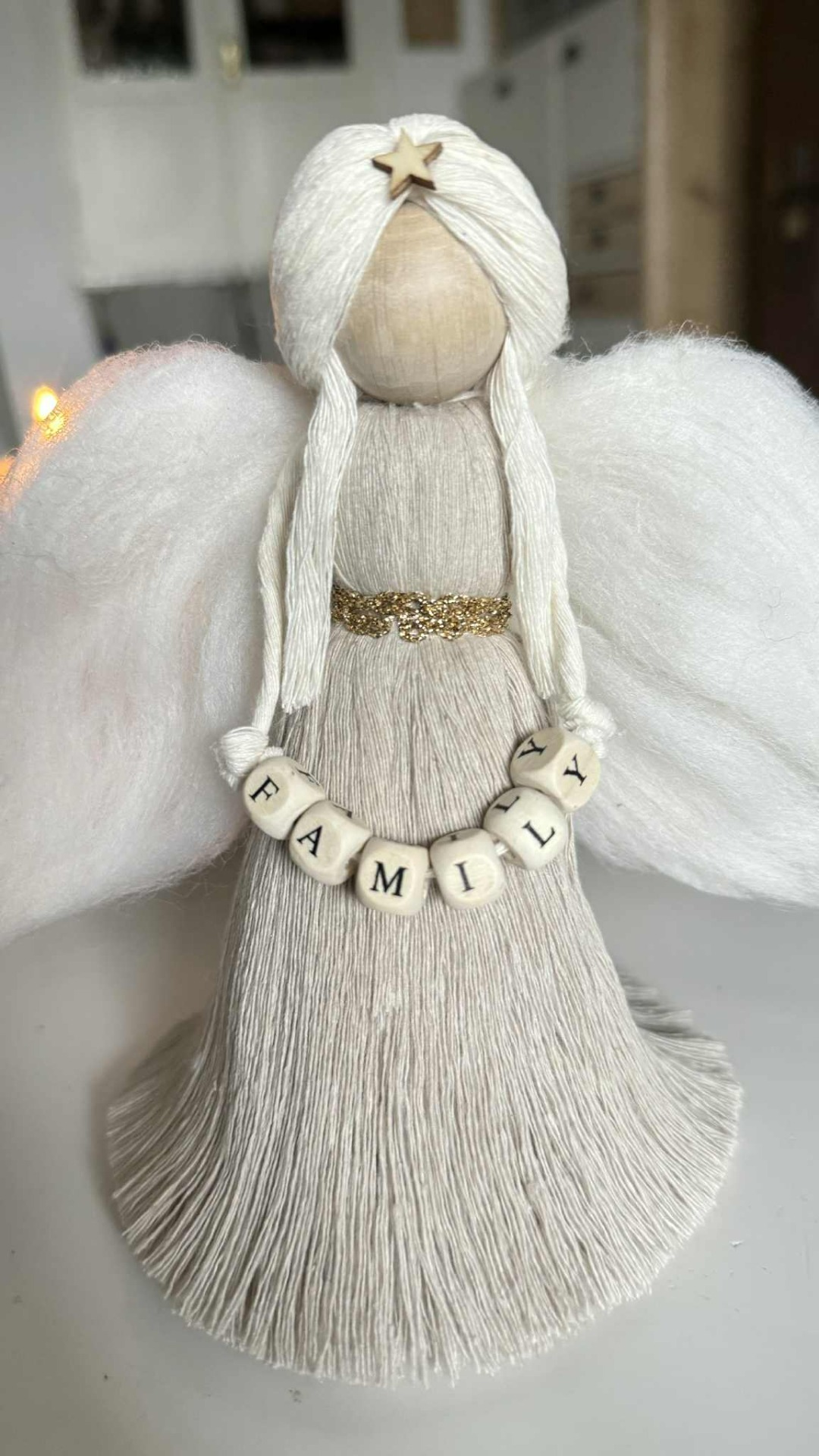 Andělka, kterou jsem pro Vás vyrobila může být nejen něžnou dekorací Vašeho domova, ale i dárkem pro Vaše blízké. Postavena je na stojánku zdobí ji velká andělská křídla z merino vlny, výška Andělky je cca 18 cm, s nápisem FAMILY na dřevěných korálcích.