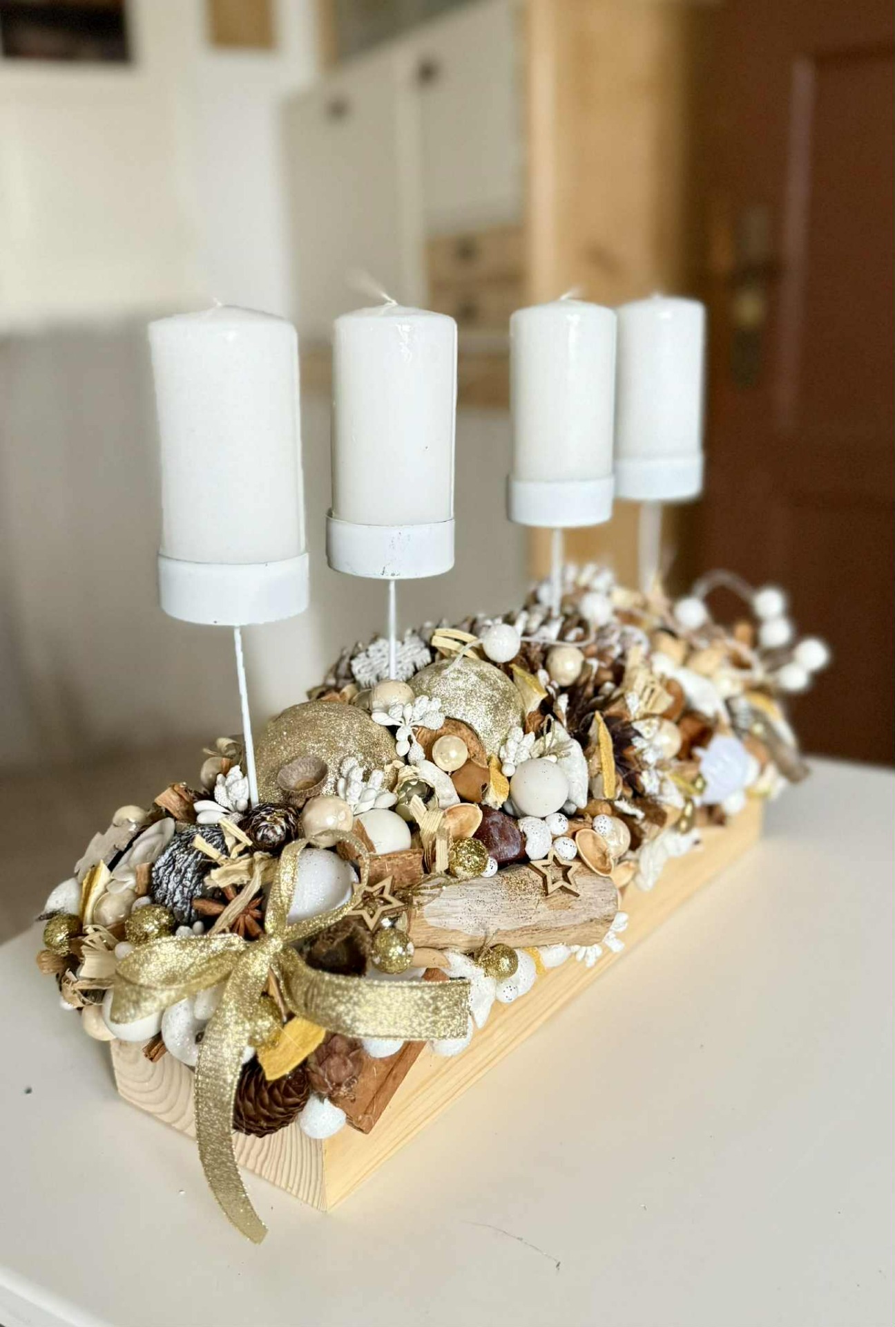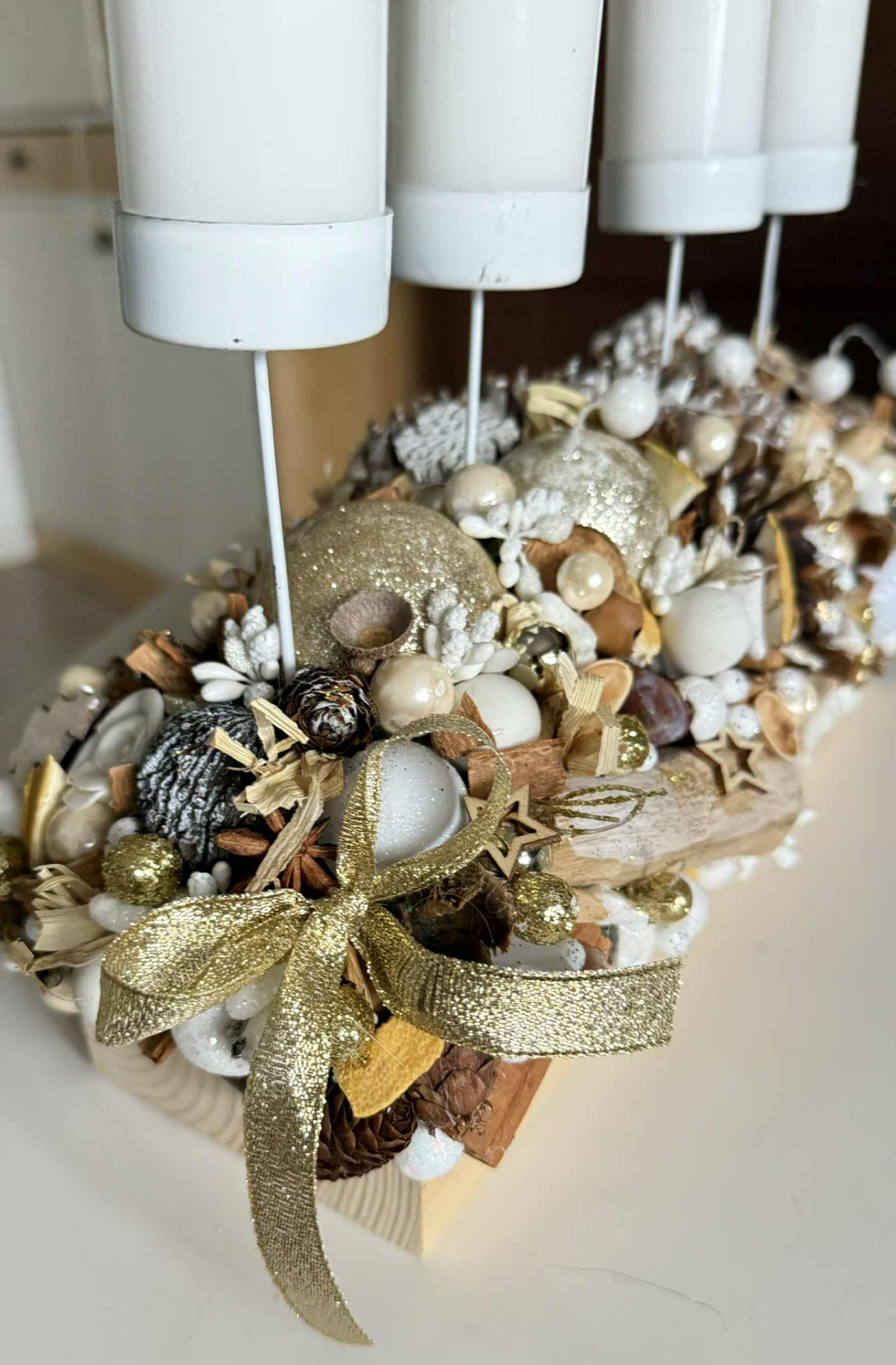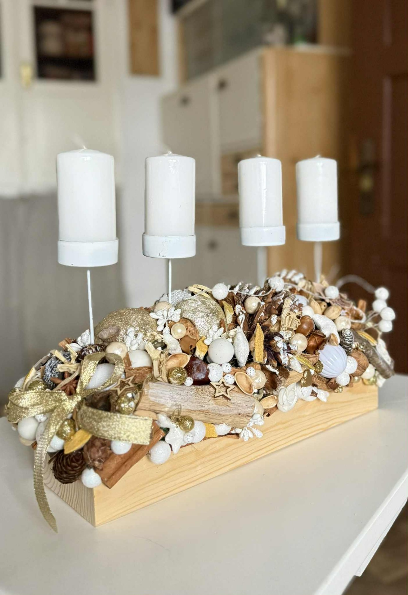 Bohatě zdobený adventní svícen na trámku v přírodním odstínu. Zdoben je především přírodními dekoracemi a doladěn vánočními přízdobami bílo-zlaté barvy.