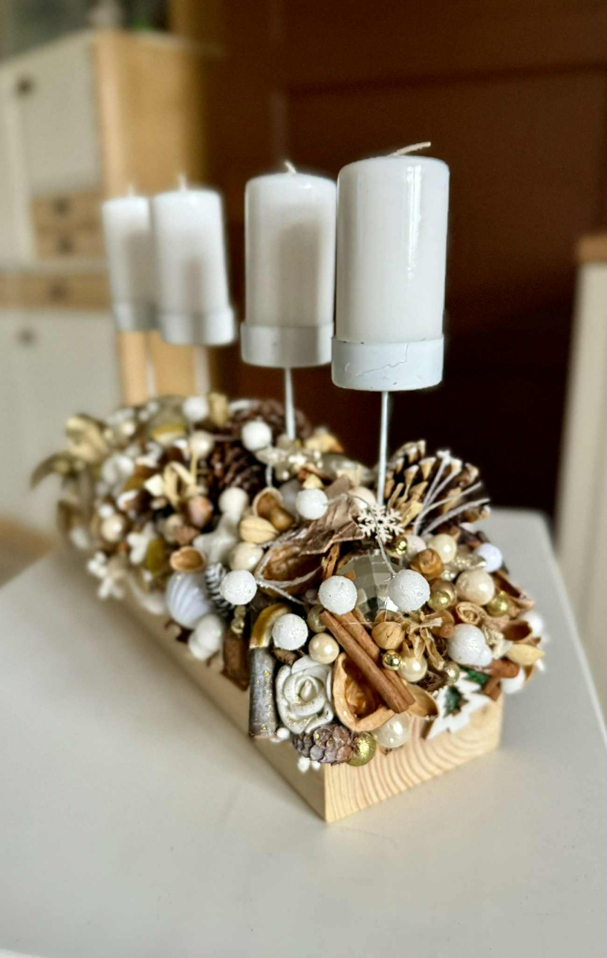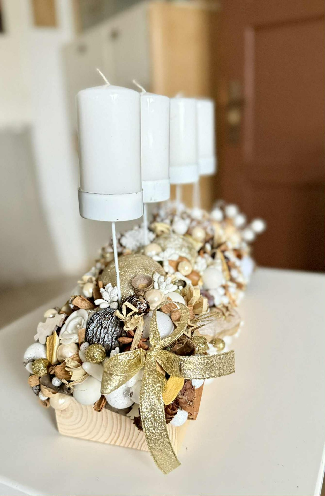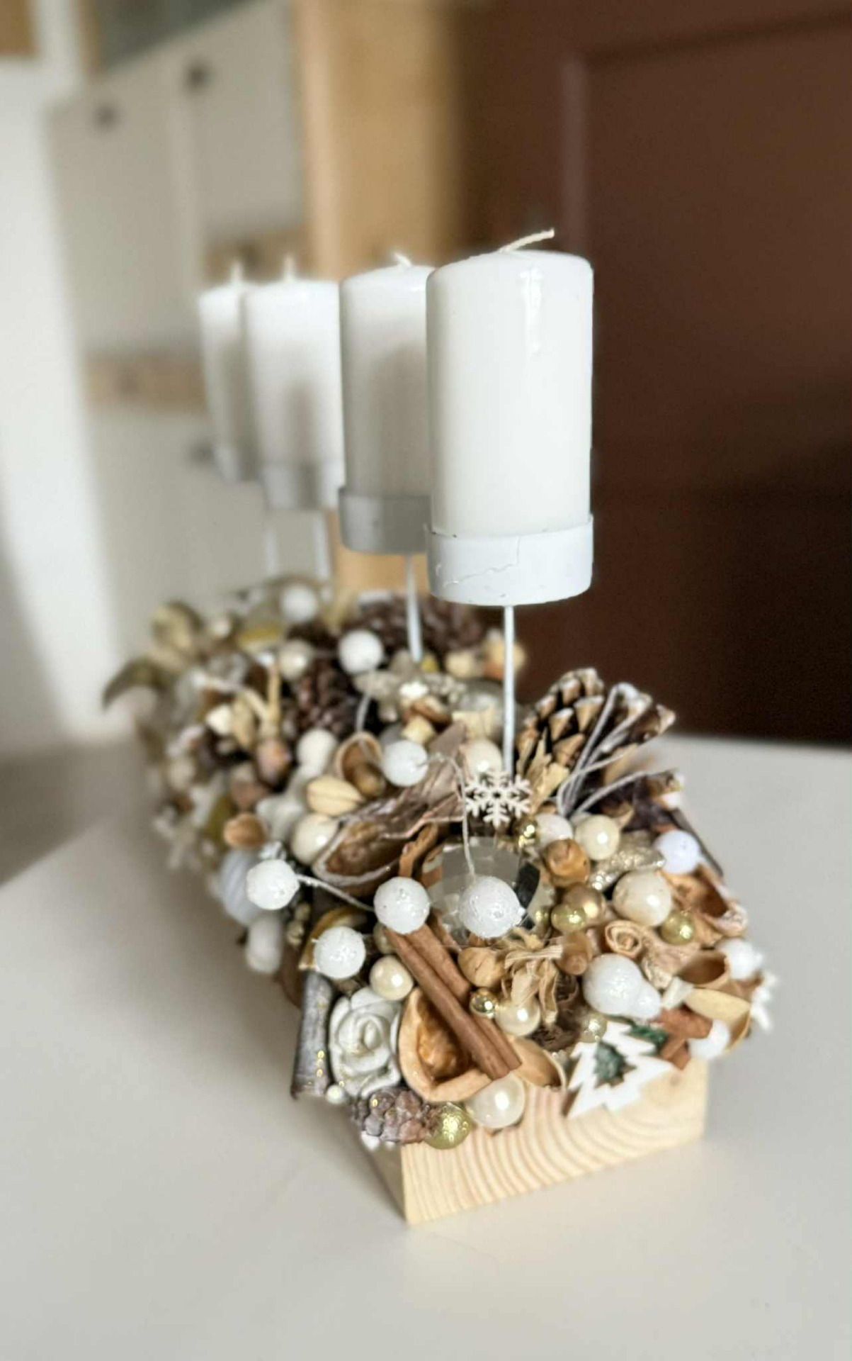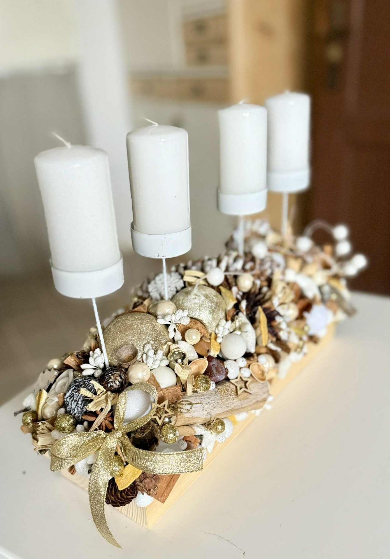 Bohatě zdobený adventní svícen na trámku v přírodním odstínu. Zdoben je především přírodními dekoracemi a doladěn vánočními přízdobami bílo-zlaté barvy.